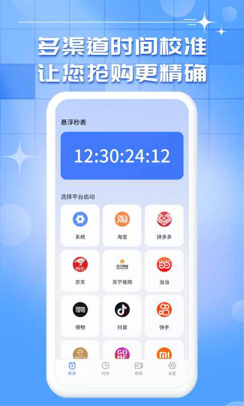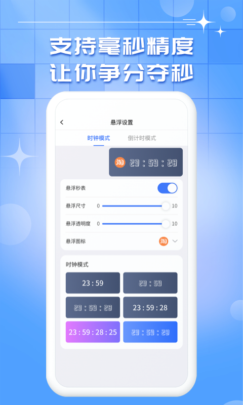 悬浮秒表具备两种悬浮模式,分别是时钟模式和倒计时模式。这就使得它成为秒杀的得力神器,因为您在使用任何APP时它都能悬浮显示,轻松为您把握时间。