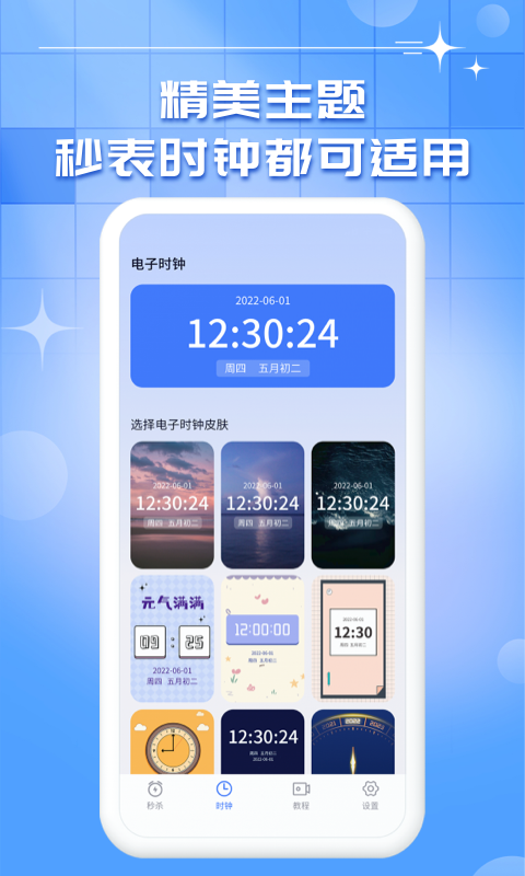 这里有多种时钟主题供您挑选,无论是秒表还是时钟功能都能适用这些主题。
