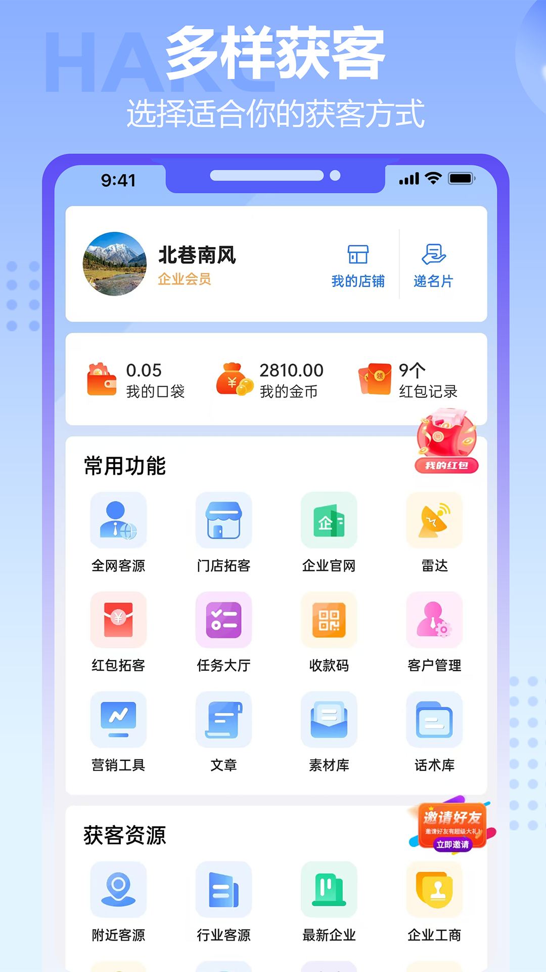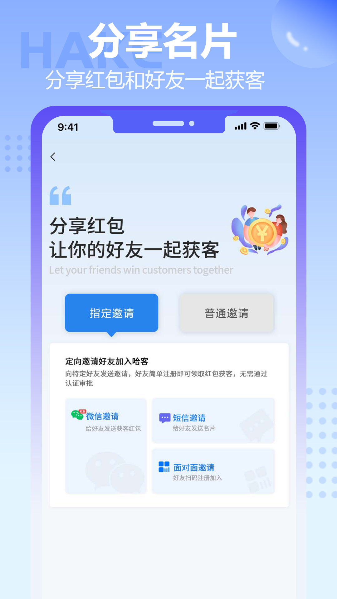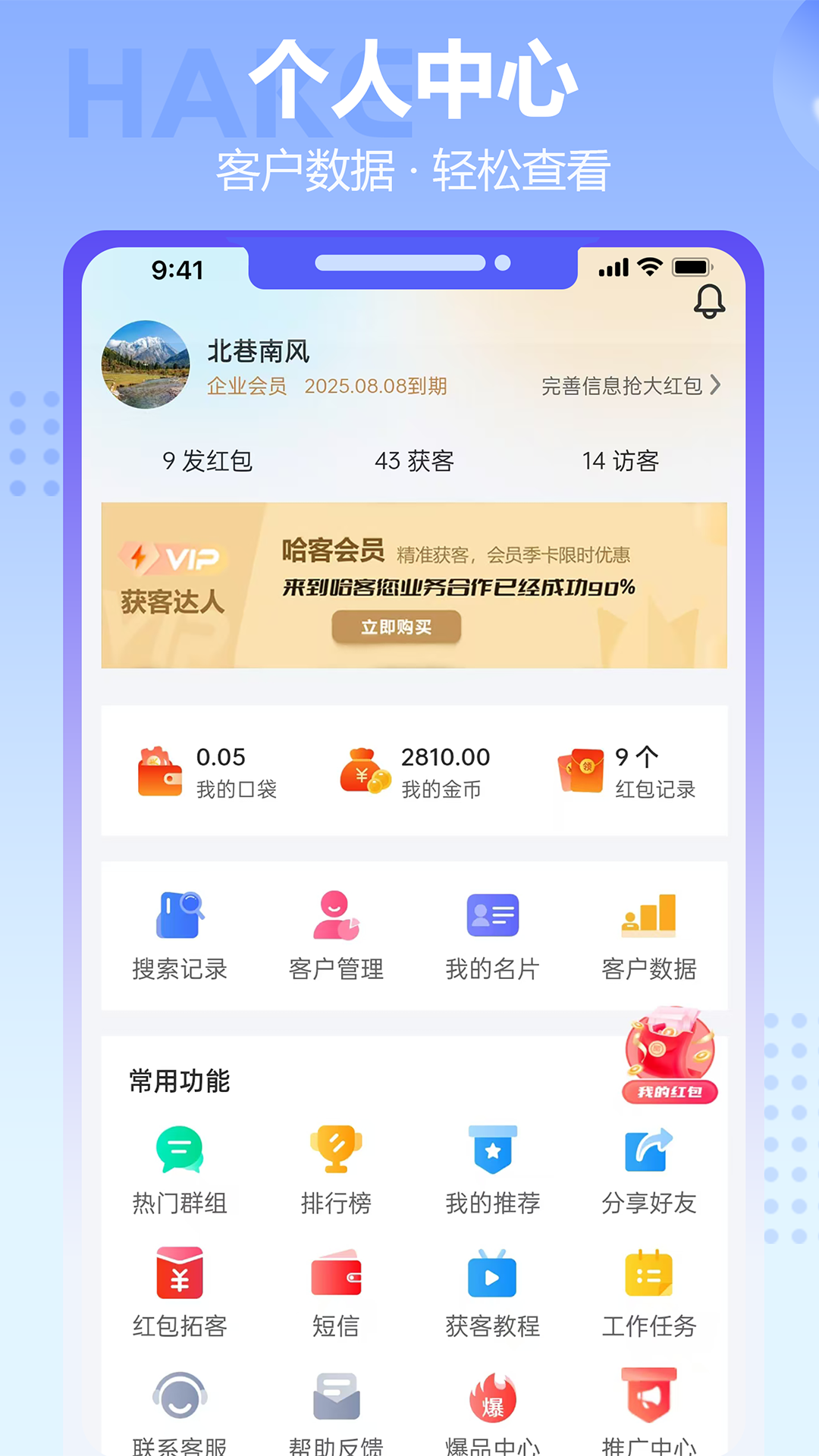 哈客APP凭借一张名片和一个红包构建起企业快速获客系统,这个系统涵盖红包、名片、CRM、地图获客、工商企业信息、流量集成、流量共享以及社交等多个子系统,它开创了B2S2C模式,使老板和销售员能够与客户顺利衔接,从而助力销售员达成交易,让老板获取客户数据以及流量资产。