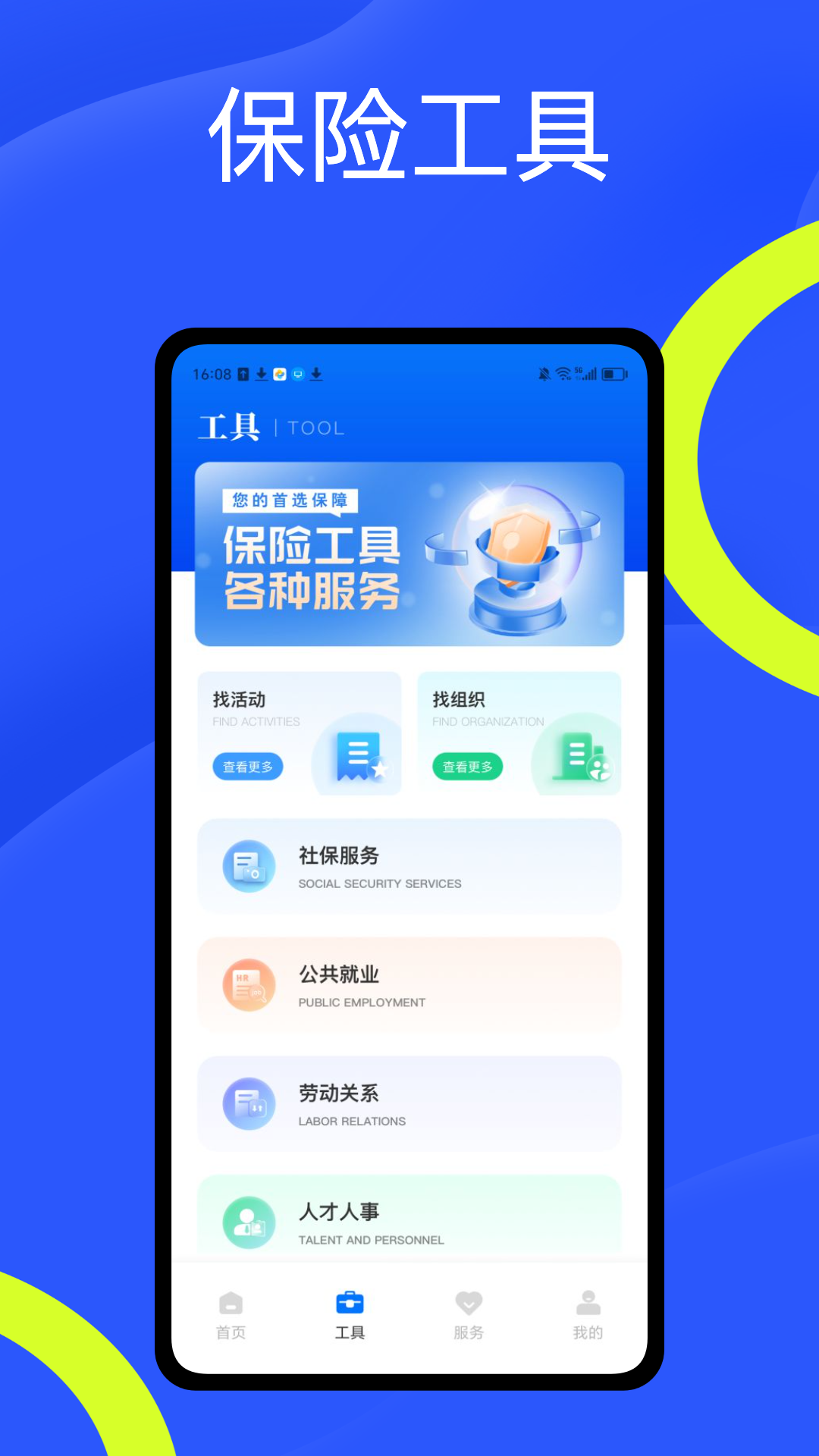 3. **实用工具集成**:这里整合了多方面的实用工具。在人才人事方面,能够为企业或个人提供人事管理相关的支持;公共就业板块则提供就业相关的信息与服务;劳动关系板块有助于协调和管理劳动关系相关事务;社保服务板块方便用户查询和了解社保相关的各项信息。