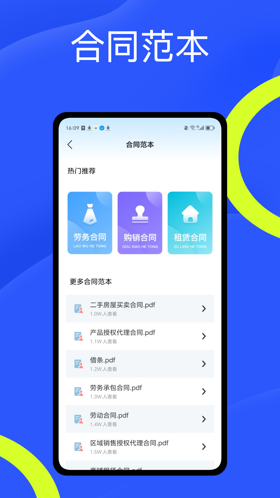 2. **合同范文提供**:该APP提供多种类型的合同范文,其中包括劳动合同、购销合同以及租赁合同等。这些范文为有相关需求的用户提供了规范、标准的合同模板参考,有助于用户在签订各类合同时避免一些不必要的风险和纠纷。