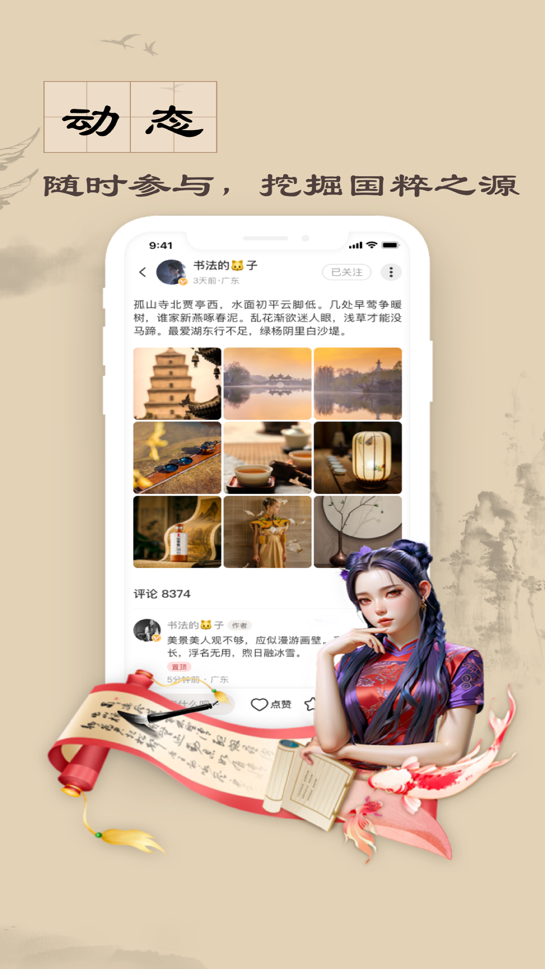APP内丰富的互动功能,让您随时随地品鉴、学习和分享喜欢的国粹作品。通过参与活动,与其他爱好者交流心得,共同进步。同时,国粹大师、艺术家的亲自指导,让您有幸接触到艺术的精髓。