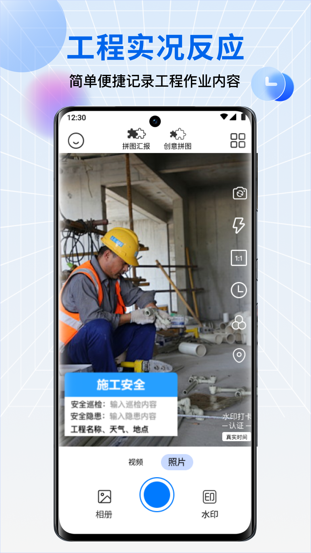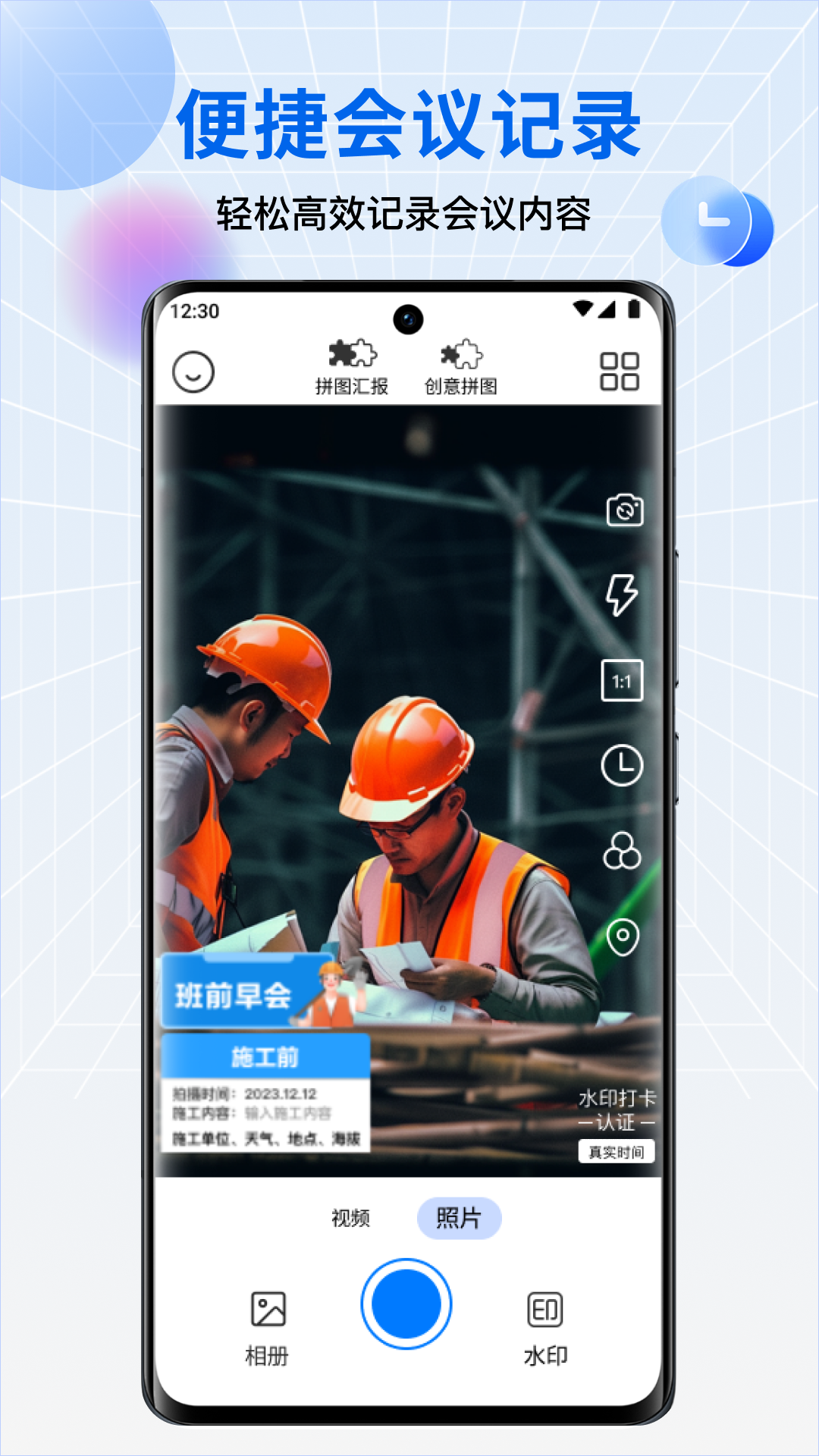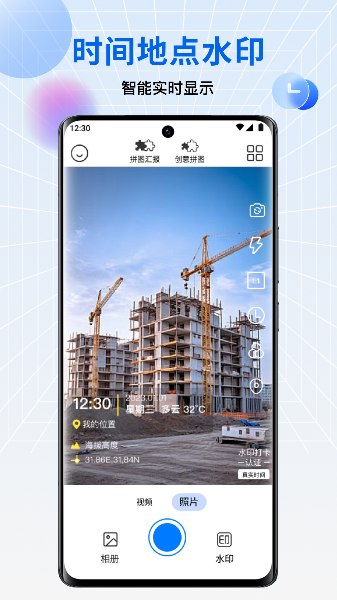 支持拍摄和从相册选择照片来添加各种水印,可以改变水印大小及透明度。