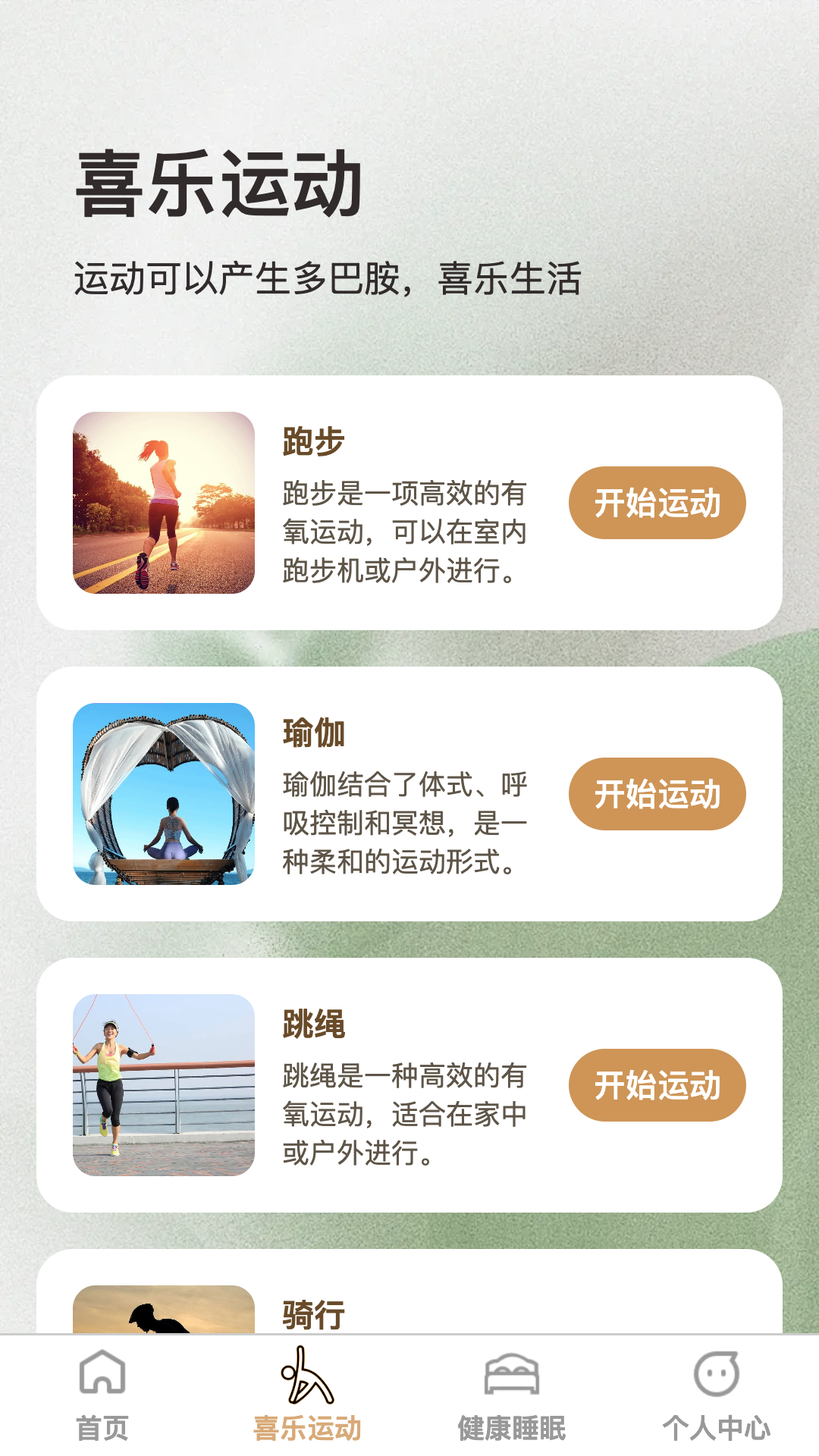 【喜乐运动】喜乐运动模块提供多种运动介绍和计时功能,包括跑步、瑜伽、跳绳等,适合不同用户的运动需求,让您在锻炼中享受乐趣,提升身体素质。