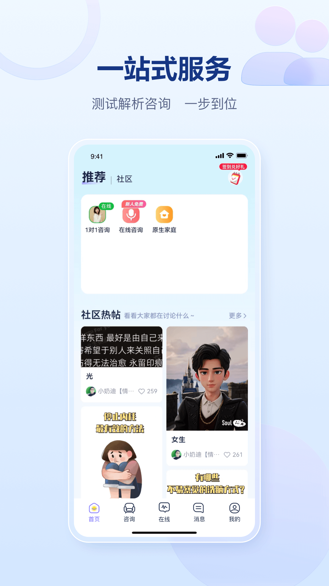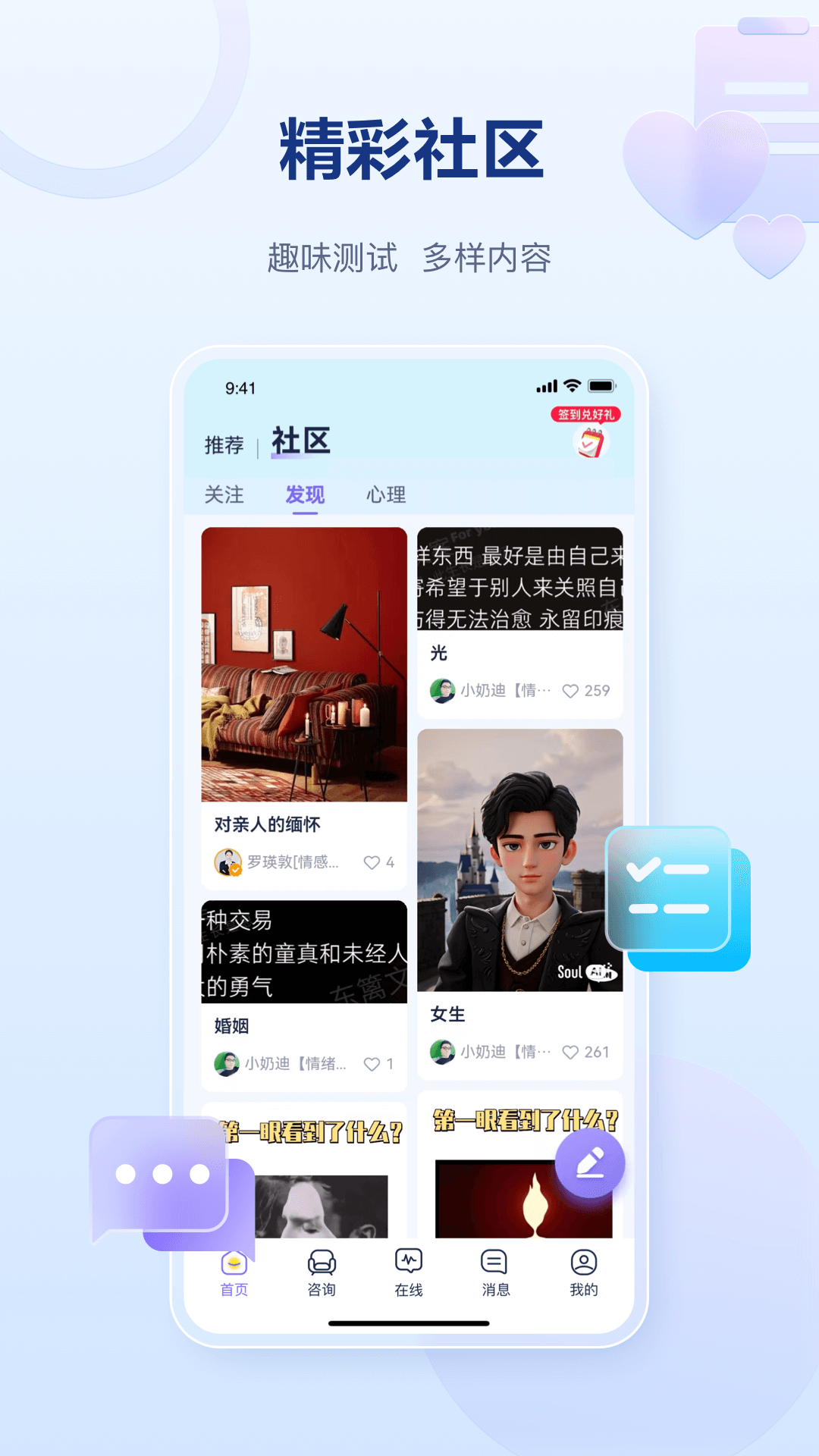 这里有关于感情、财富、婚姻、事业、星座运势的测试,还有抑郁症测试、焦虑症测试等专业心理测试。另外,亲密关系、性格分析、星盘解读、八字合盘等有趣功能也应有尽有,能够助力您开启内心世界,全方位认识自己。