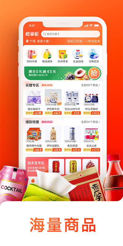 橙心优选携手源头品牌商以及优质的本地供应商,从而能够为各类零售小店提供品质优良的商品货物,服务于数以千万计的小店店主。橙掌柜APP具备多种功能,例如商品搜索、商品浏览、商品购买、在线支付、订单浏览等。