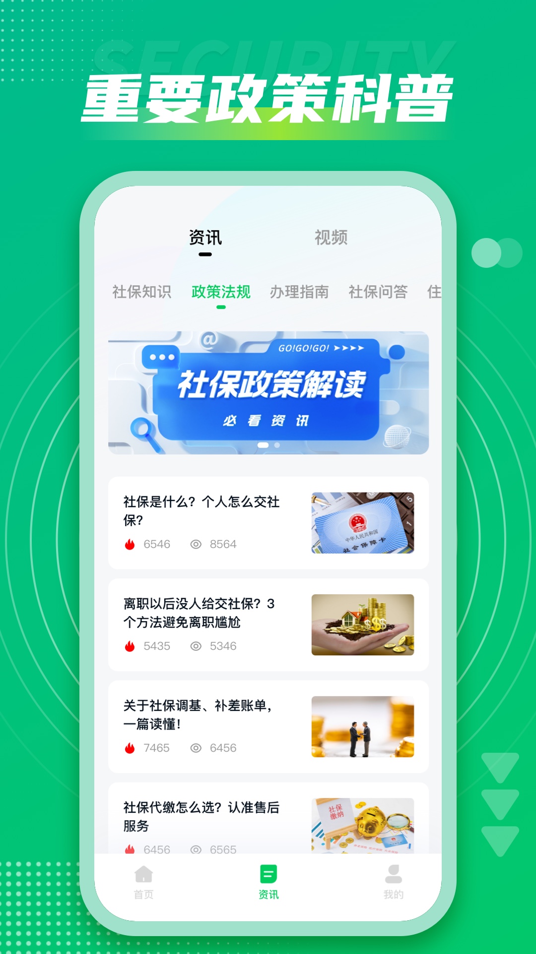 “社保通”会实时更新全国范围内的养老保险、医疗保险、生育保险、失业保险、工伤保险以及住房公积金的政策资讯,让您时刻掌握社保的最新动态。