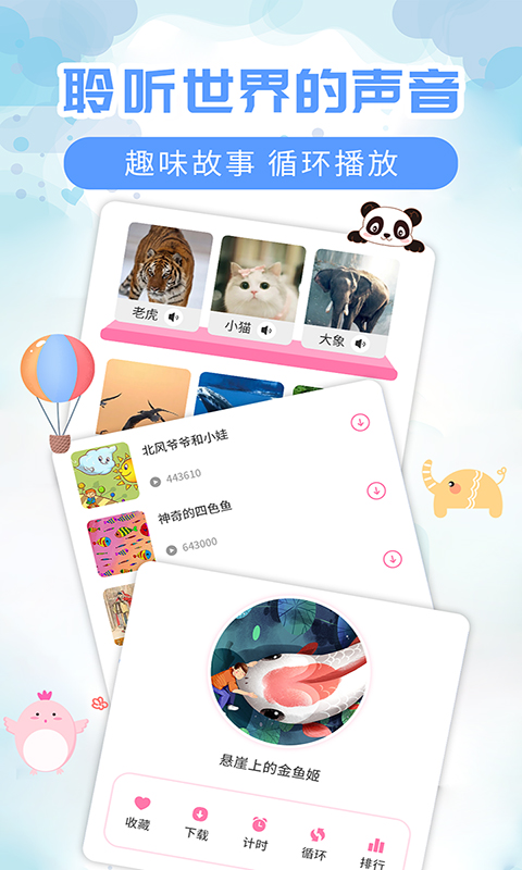 这里有热门动听的儿歌童谣、轻柔的哄睡音乐,还有经典有趣的睡前故事、安徒生童话、能进行成语启蒙的故事,以及古诗词朗诵、三十六计故事、解答十万个为什么等丰富的有声内容,这些都能给孩子开拓更多的想象空间,激发宝宝求知探索的欲望。