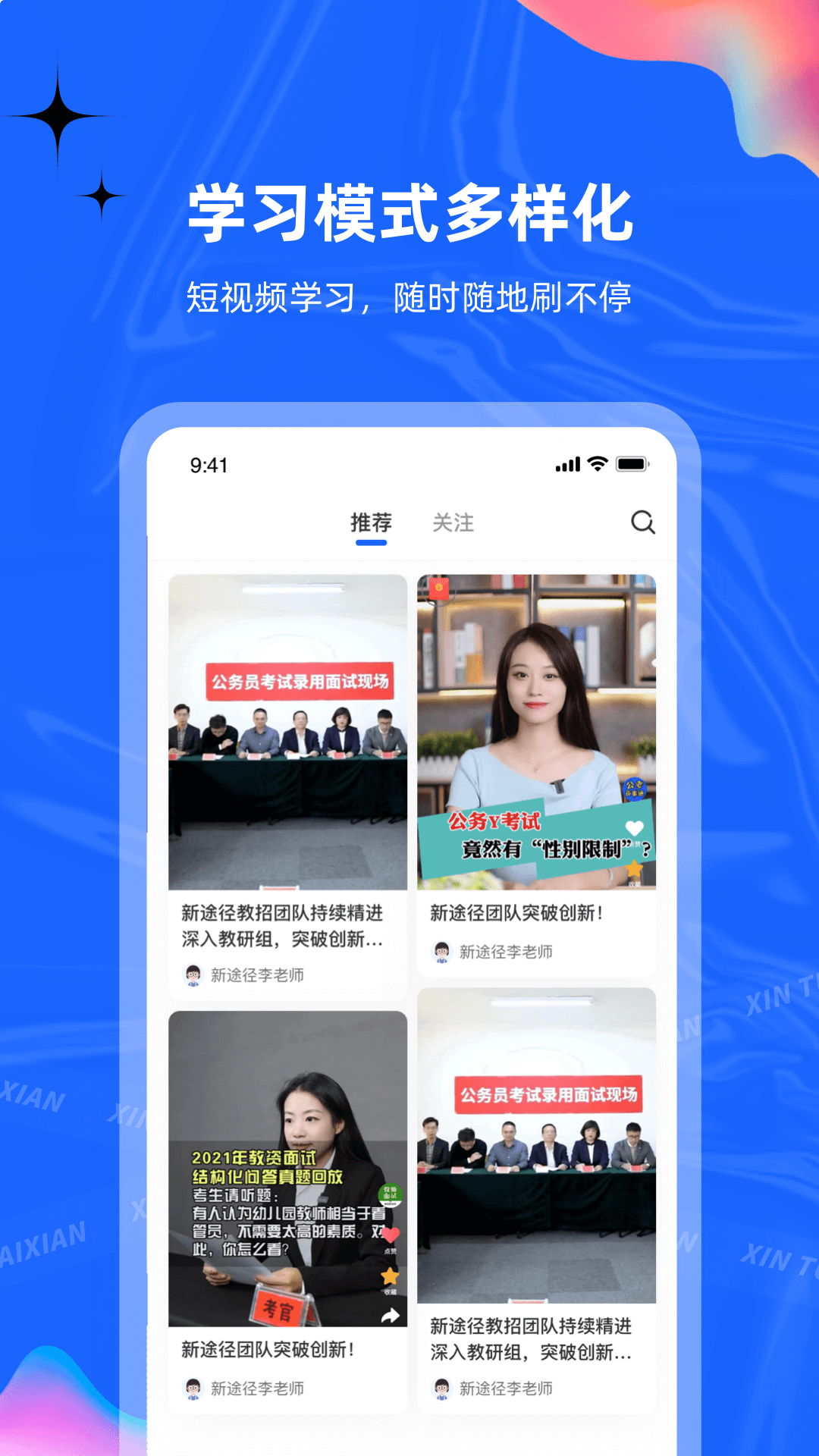 新途径在线精心挑选专业的名师团队,规划了丰富多样的课程类型,还推出优质的免费网课,这些资源可供用户在微信&QQ小程序、APP以及网页等多端免费享用。