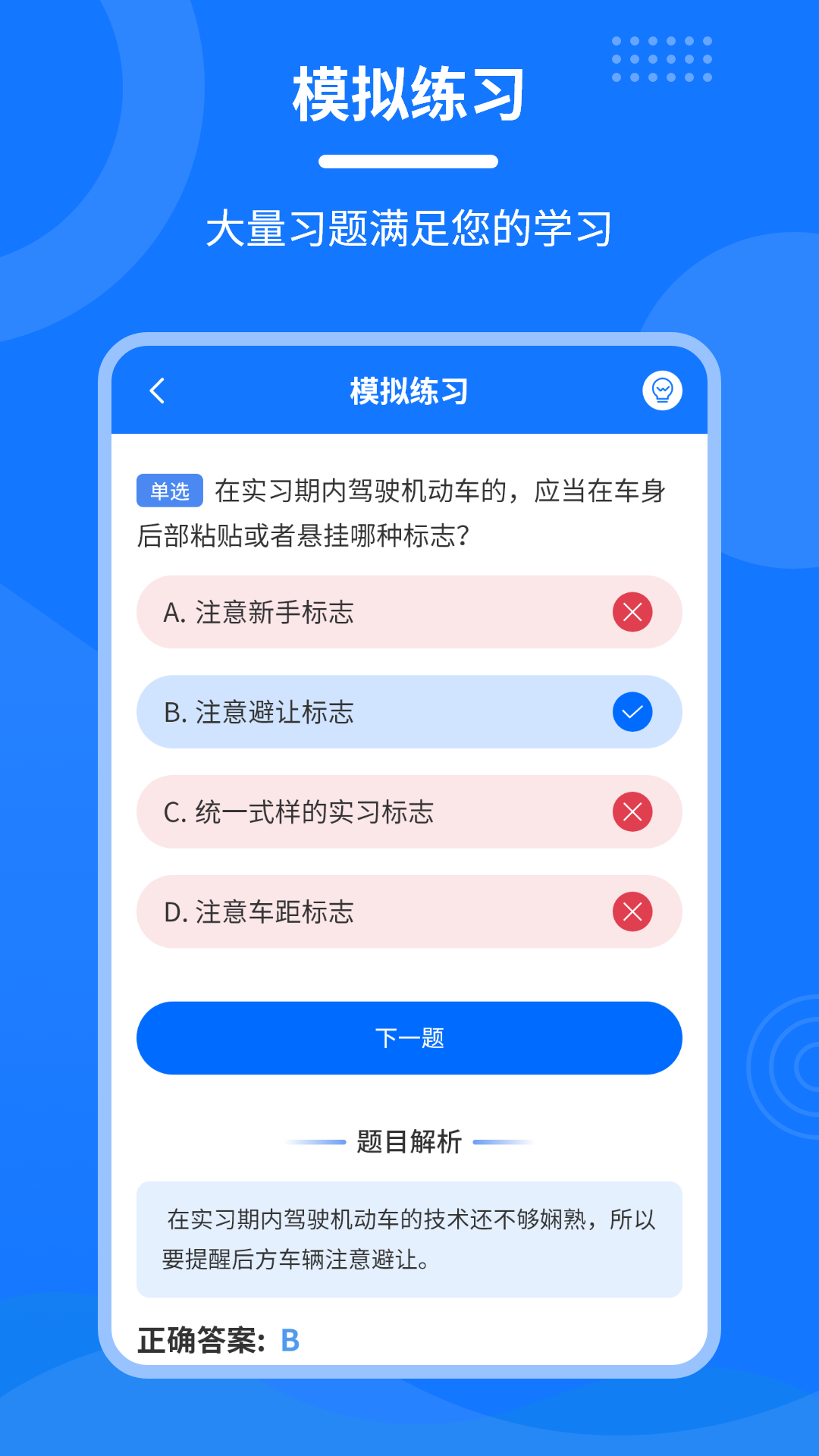 这款软件通过对大数据的深度挖掘分析,采用科学有效的方法来帮助考生顺利通过学法减分考试。它适用于全国各地ABC驾驶证的题库,是车主应对学法减分考试的得力助手。