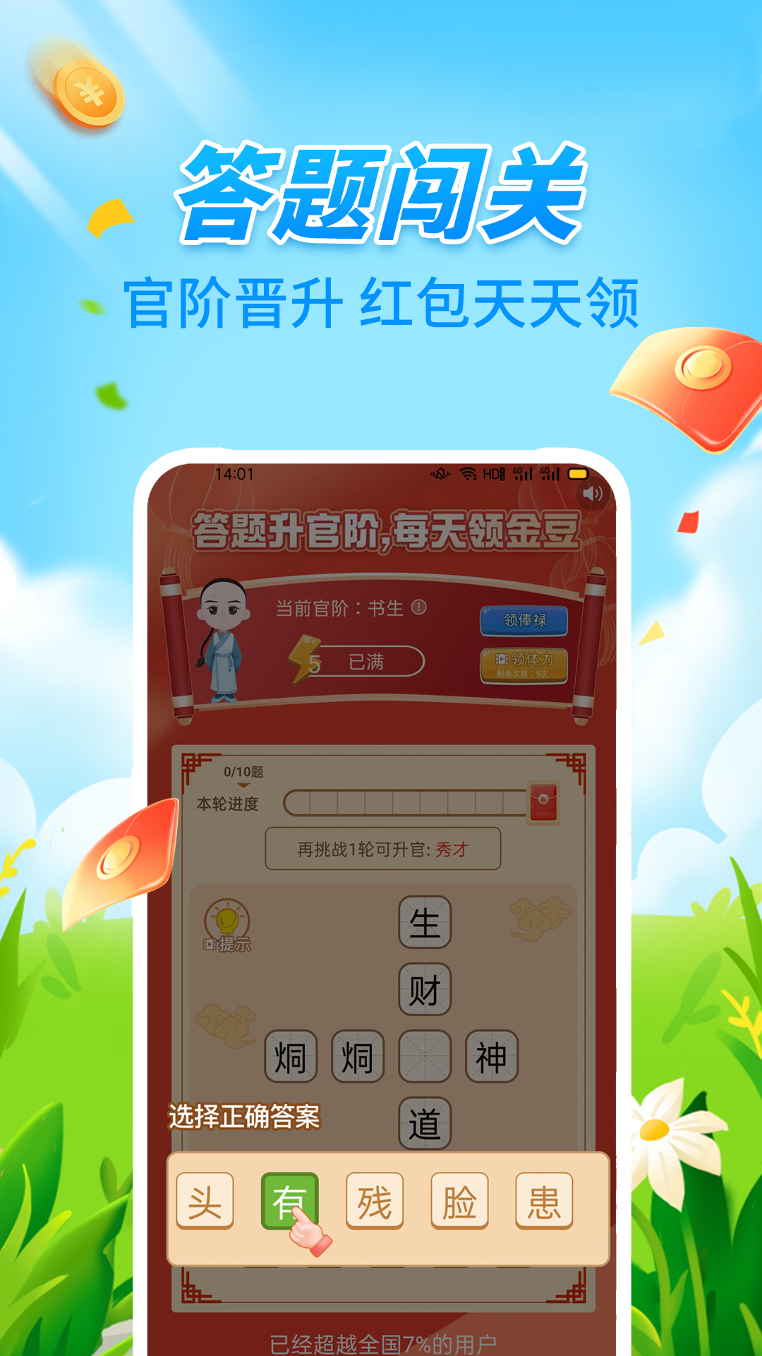 【答题赚——红包领不停】这个应用里有各种各样有趣的游戏,只要您动动手,就能轻松拿到红包奖励。每天都可以参加抽红包活动,还有幸运大转盘、红包雨等活动等着您参加,让您轻轻松松就把零花钱赚到手。