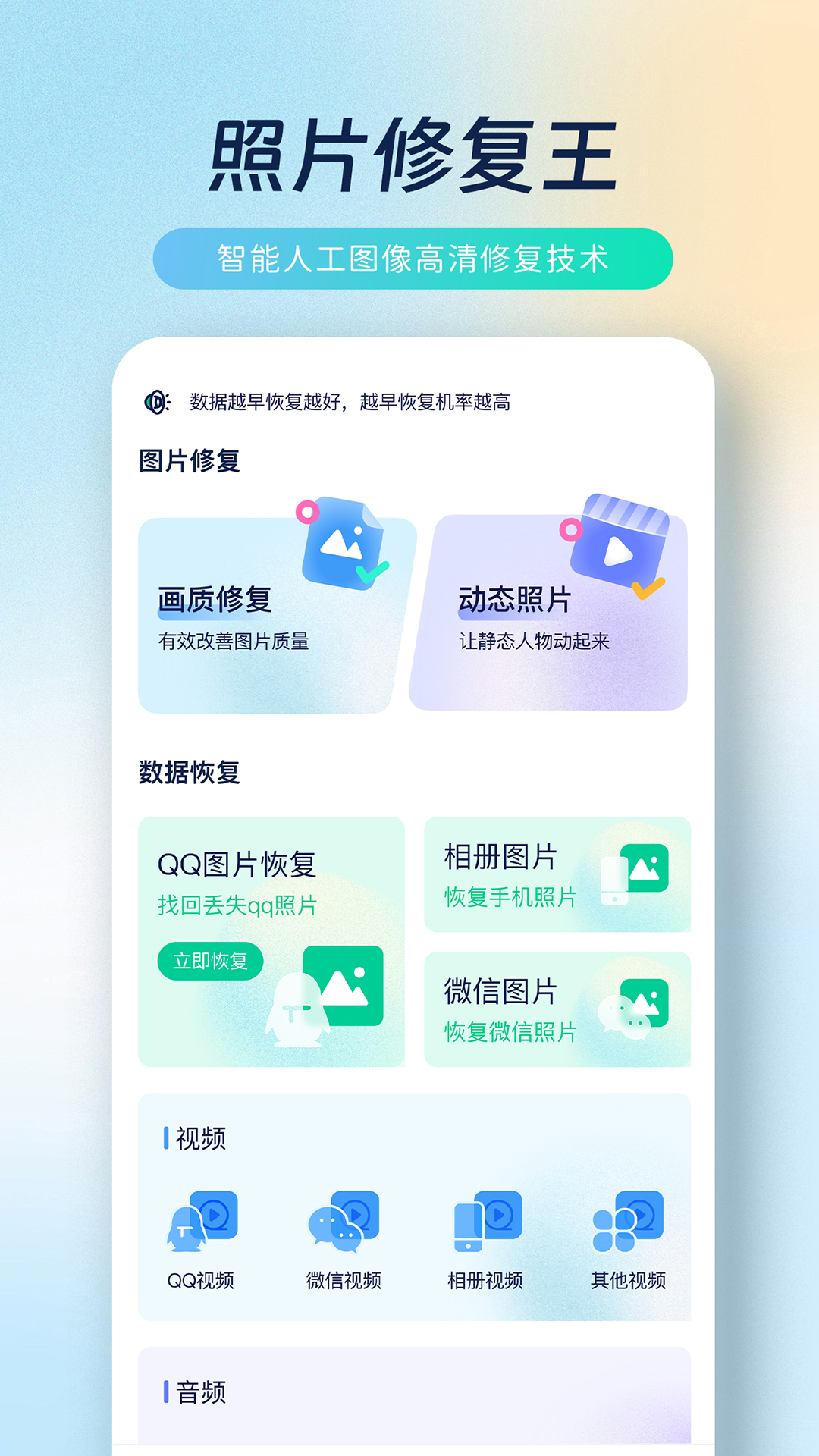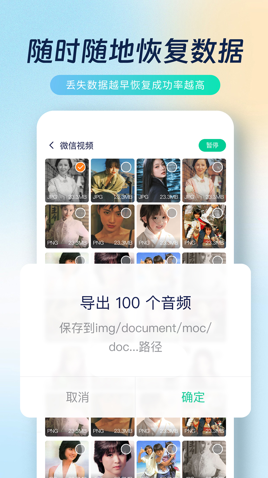 - 支持微信聊天记录,相册照片或视频,录音机或微信语音恢复 ,文件文档恢复