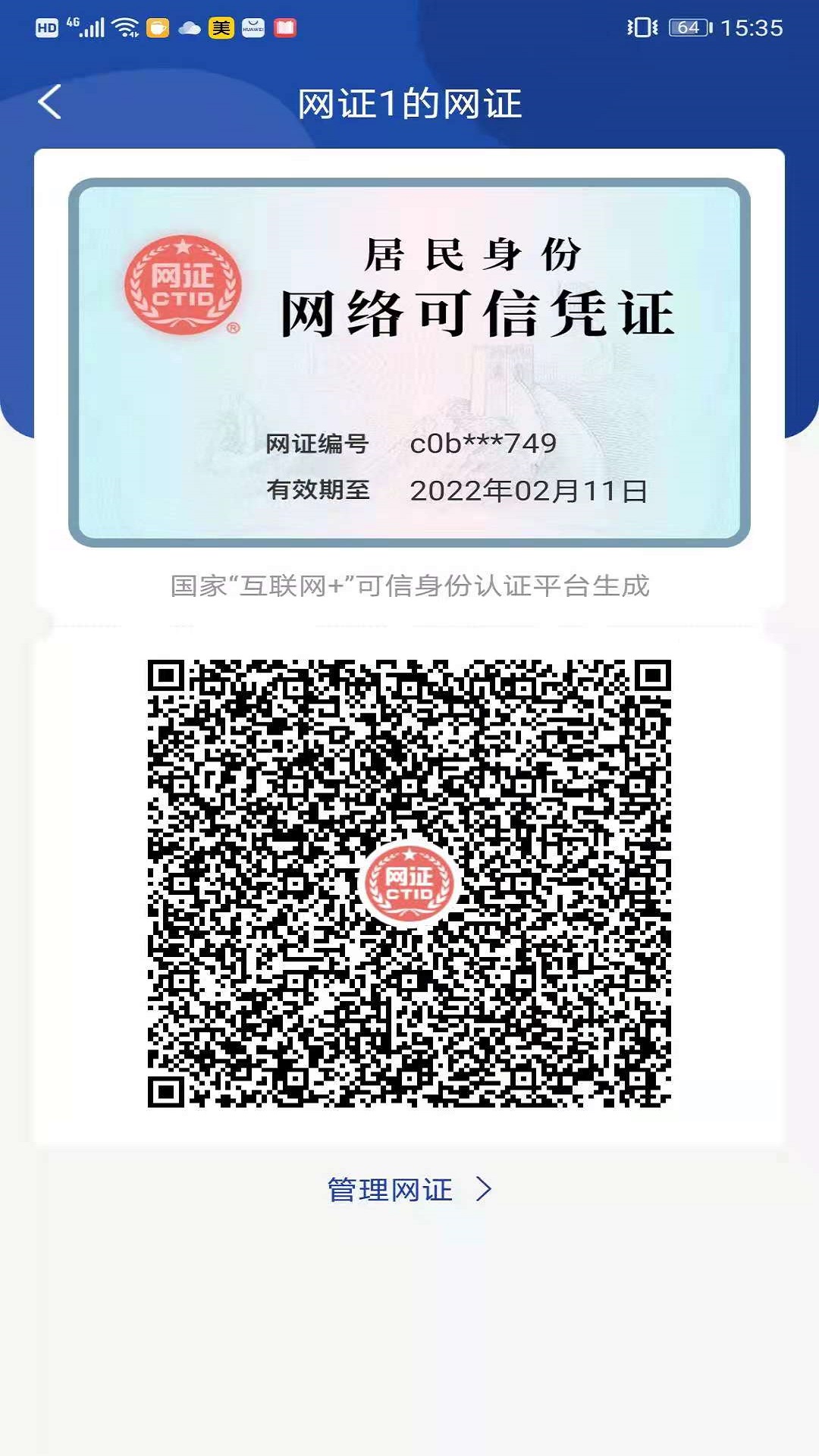 “居民身份网络可信凭证”(简称为“网证”或者“CTID”)是CTID平台签发给个人的具有权威性的网络身份凭证。在进行网络活动的时候,个人使用网证来替代身份信息进行认证,这有助于有效地保护个人隐私。网证以公安部法定身份证件制证数据为依据,运用国密算法,CTID平台会对法定身份证件所包含的身份信息进行脱敏、去标识化处理,从而统一生成一种不可逆、不包含明文信息并且和法定身份证件一一对应的的数据文件,如此便能够在不暴露身份信息的情况下达成在线身份认证。