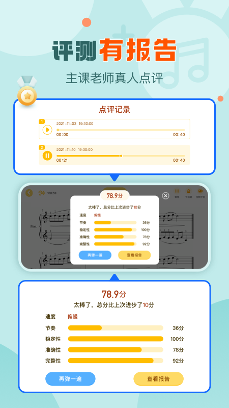您想知道自己弹奏这首曲目或者某些段落的水平如何吗?完全没问题!爱弹奏支持全曲评测和分段评测,评测完成后会自动生成多维度的打分报告,您每次的进步在报告中都能清晰呈现,而且能够依据各维度的薄弱之处进行针对性提高。
