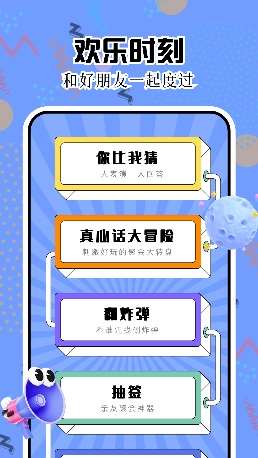 这里有着趣味满满的互动游戏,像“你比我猜”,通过动作传递信息,趣味无限;“真心话大冒险”,是对彼此勇气和真诚的挑战;“翻炸弹”,这个游戏能考验玩家敏捷的反应能力;还有“抽签”,它会给你带来意想不到的惊喜与期待。