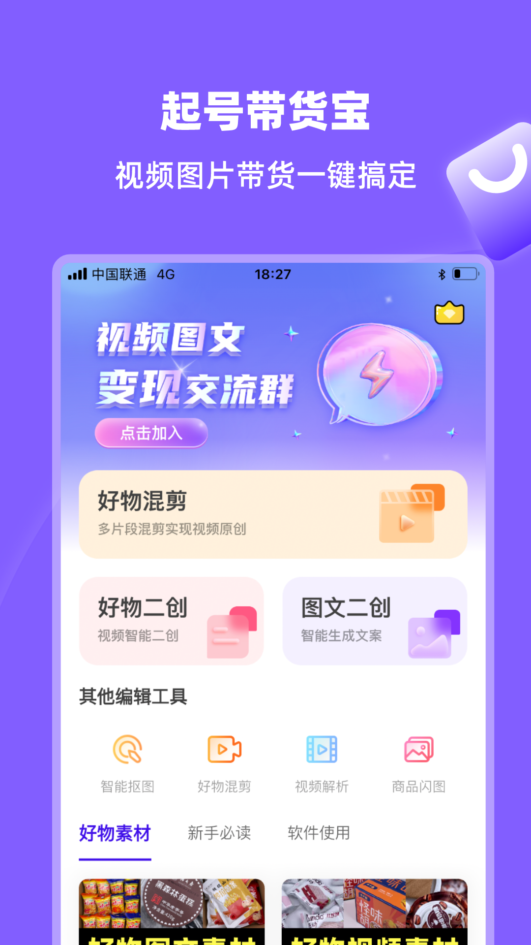 起号带货宝为用户精心打造了一系列实用的作图工具,涵盖素材混剪、图片编辑以及图片闪图等功能,其中包括商品抠图、智能去水印、商品拼图、商品闪图等特色功能。它能借助独特的滤镜和各类工具对图片进行修饰,快速生成您理想中的效果图。