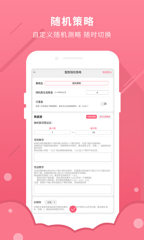 【随机策略自定义】能够创建多个随机策略,为各种场景下的随机需求提供高度定制化服务,再也不需要在配置里反复调整啦。