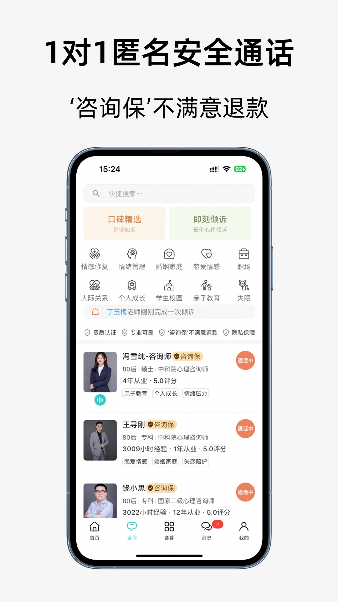 【倾听咨询】:心理咨询师在线为您提供一对一的语音通话服务。他们将以专业的态度和理解,陪伴您度过情绪的低谷。