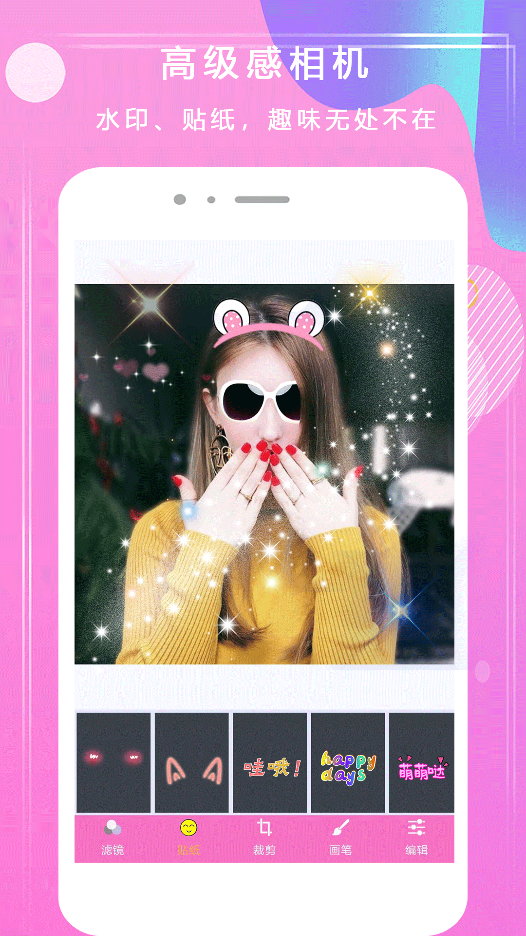 而说到P图功能,它更是强大无比,涵盖了滤镜、贴纸、水印蒙版、裁剪编辑等诸多功能。各种各样风格的滤镜,能够让您P出具有高级质感的照片;再搭配上那些可爱的趣味贴纸,瞬间就能让您充满萌力。