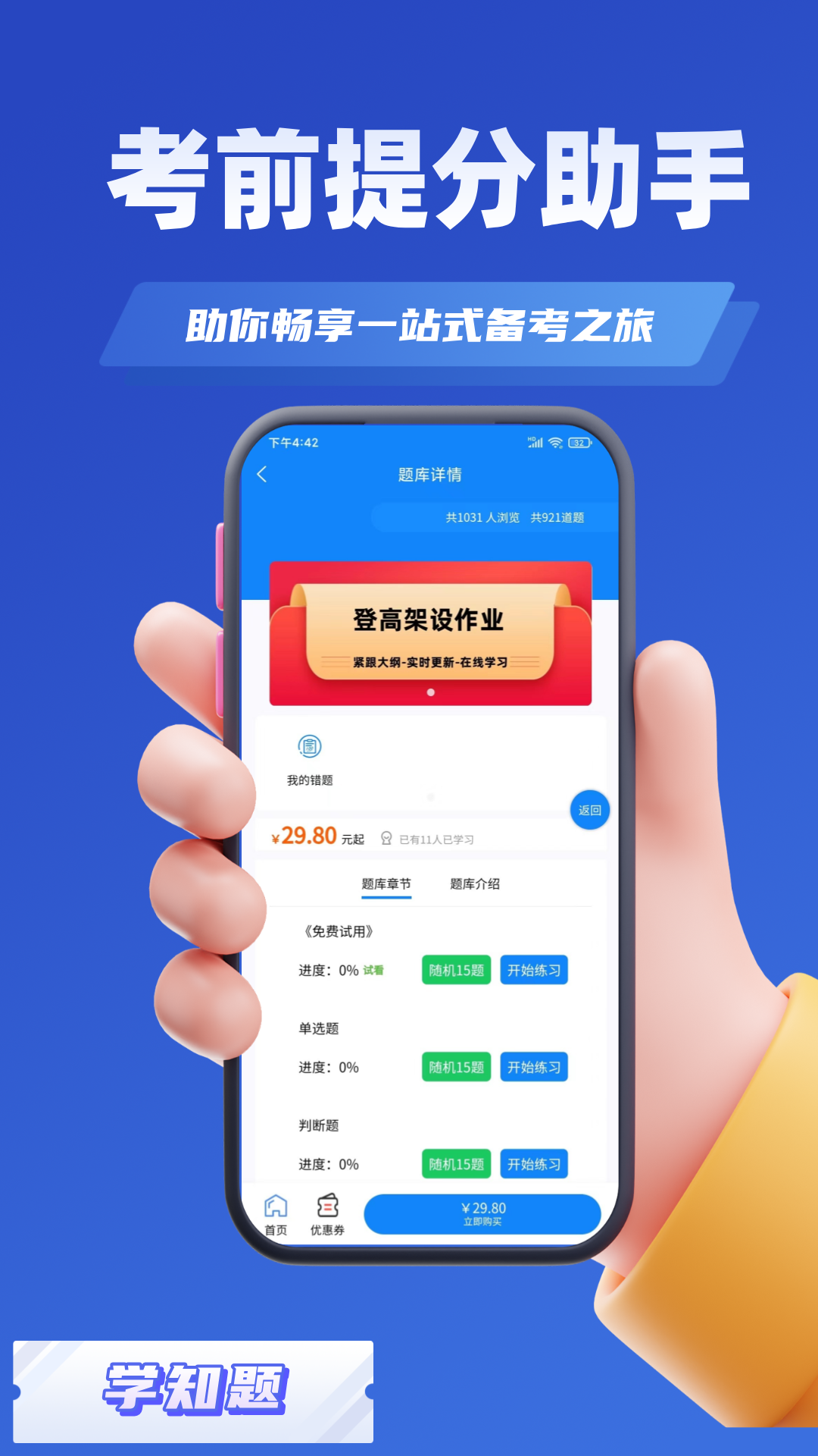 【高处作业考证学知题】涵盖了高处作业考试的全部知识点哦。这里有多个超实用的功能模块,像模拟考场、快速练习、考点练习、测试纪录以及错题重做等。学员们能够借助模拟练习来找出自己知识体系中缺失的部分以及薄弱之处,然后利用错题重做功能弥补不足,从而顺利通过考试!