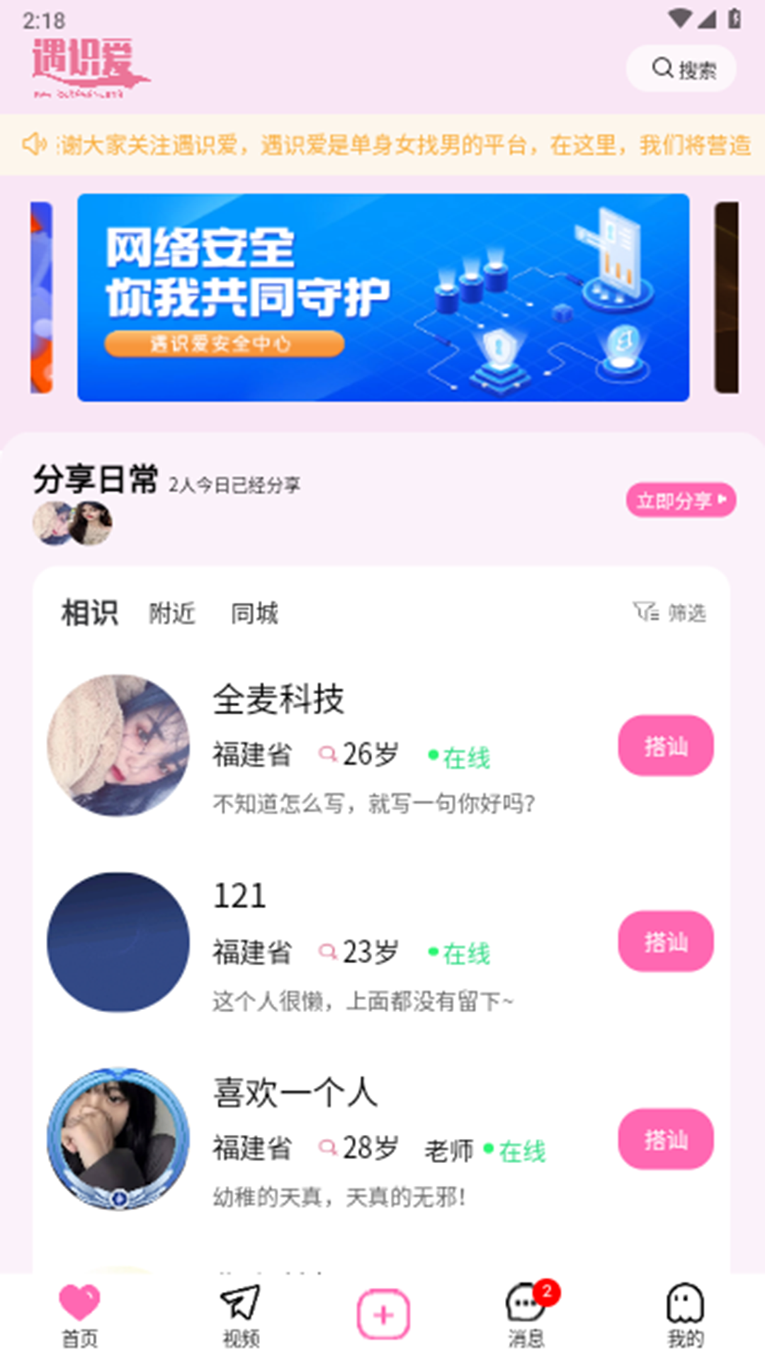 在功能服务上,遇识爱APP为用户打造了一站式娱乐服务体系。其中涵盖了视频观看、购物消费、约会安排、结伴旅游、结交朋友、互动交流等丰富内容。同时,还为用户提供聊天、购物、交友、刷视频、分享等多种在线互动功能,满足用户多方面的需求。