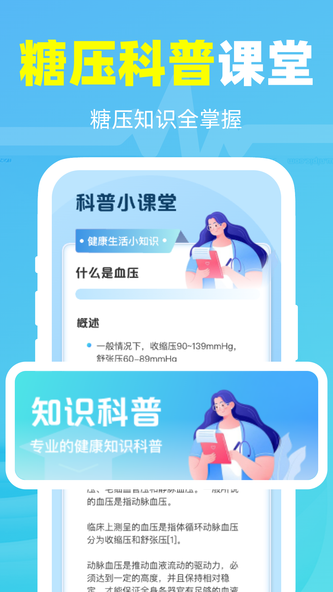 3. 知识科普,科学认知:内置了丰富且专业的血压血糖知识库,助力您以更科学的方式去认识血压和血糖健康相关的知识。