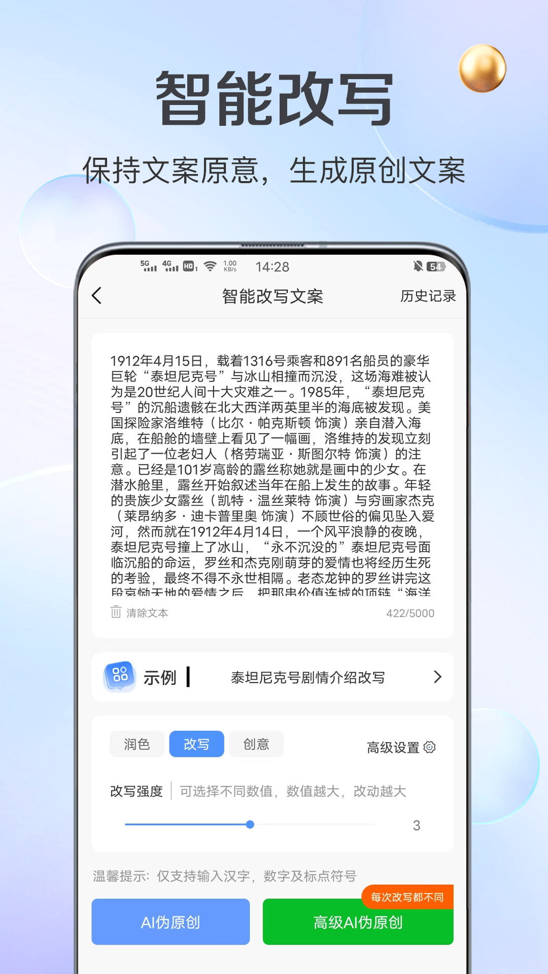 对于AI伪原创功能,您可以输入文案或者长按粘贴文案,然后一键就能生成伪原创内容。