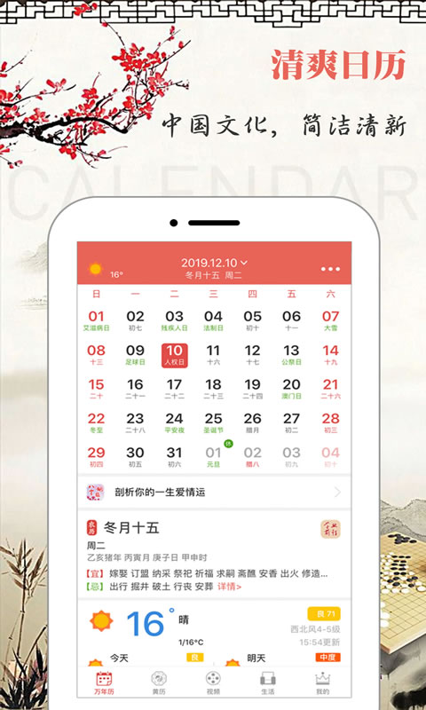 ②界面简洁,没有冗余内容,彰显中国风特色,致力于打造优质且准确的中国黄历万年历。