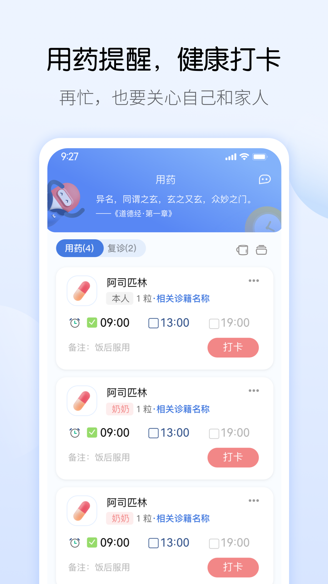 - 用药提醒:能自行定义服药时间、药品名称和用药剂量。提供多种吃药提醒方式,无论是每天服药还是隔天服药的模式都能支持,而且可以实时打卡,有效避免遗忘服药。