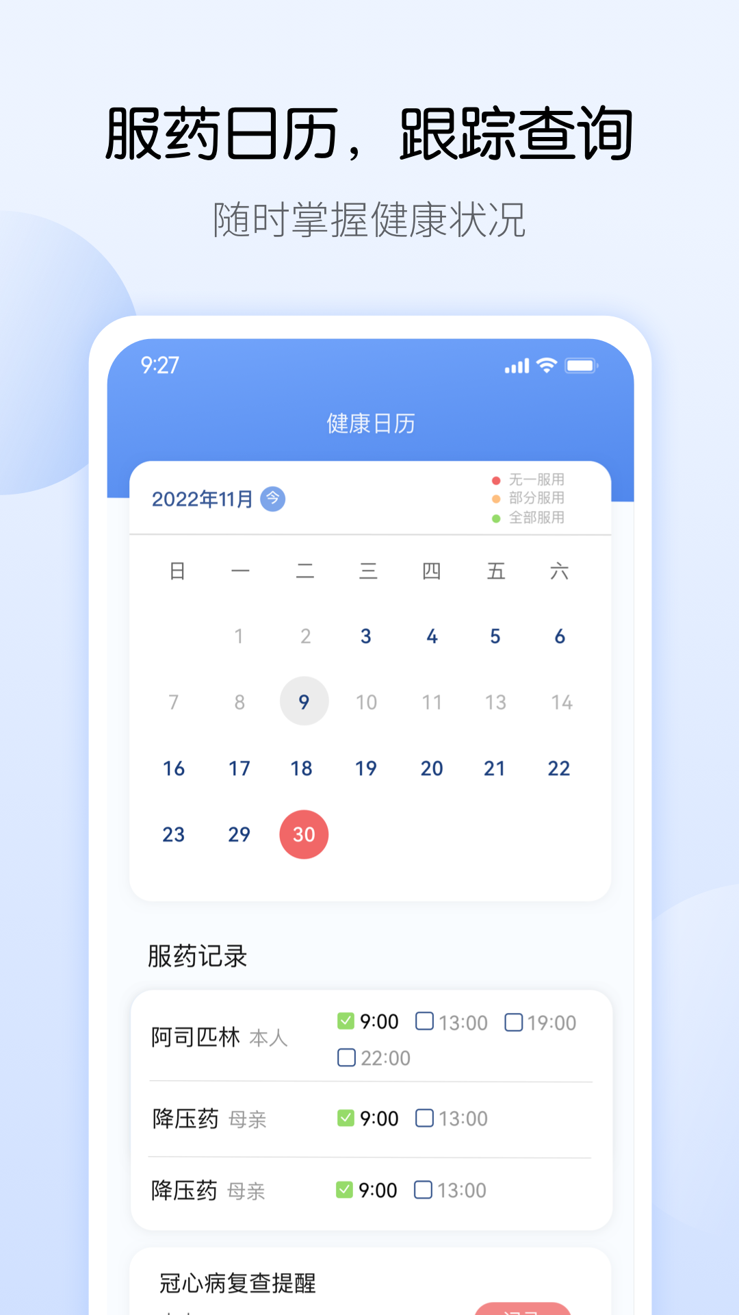 - 服药记录:对每日的服药状况进行记录,随时都能查看历史用药的详细情况。