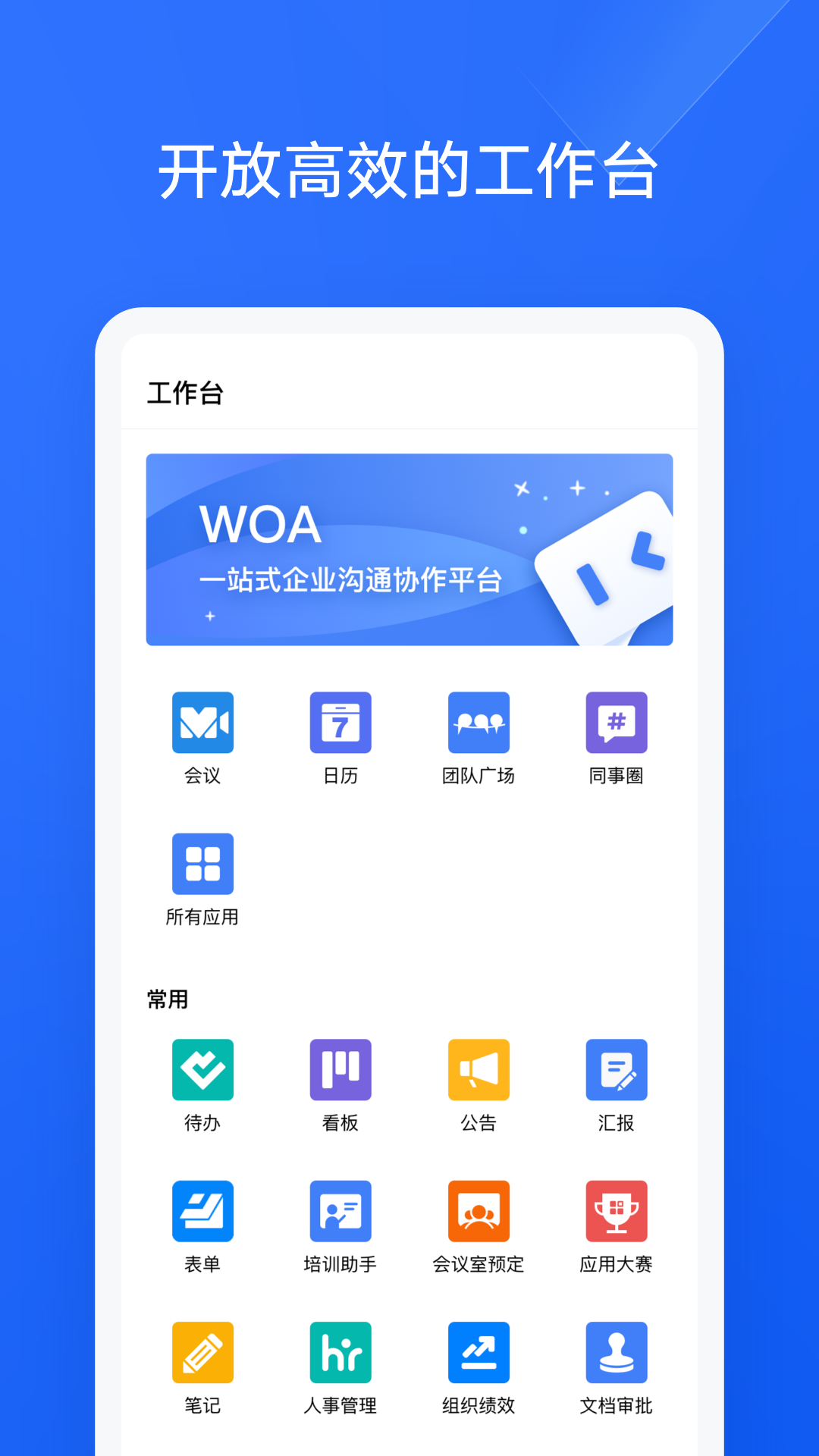 WOA 是一站式企业沟通与协作平台,整合聊天、日历、在线文档、会议等功能于一体,打造个人的高效办公工作台,让你无需在多个应用中分身游走。