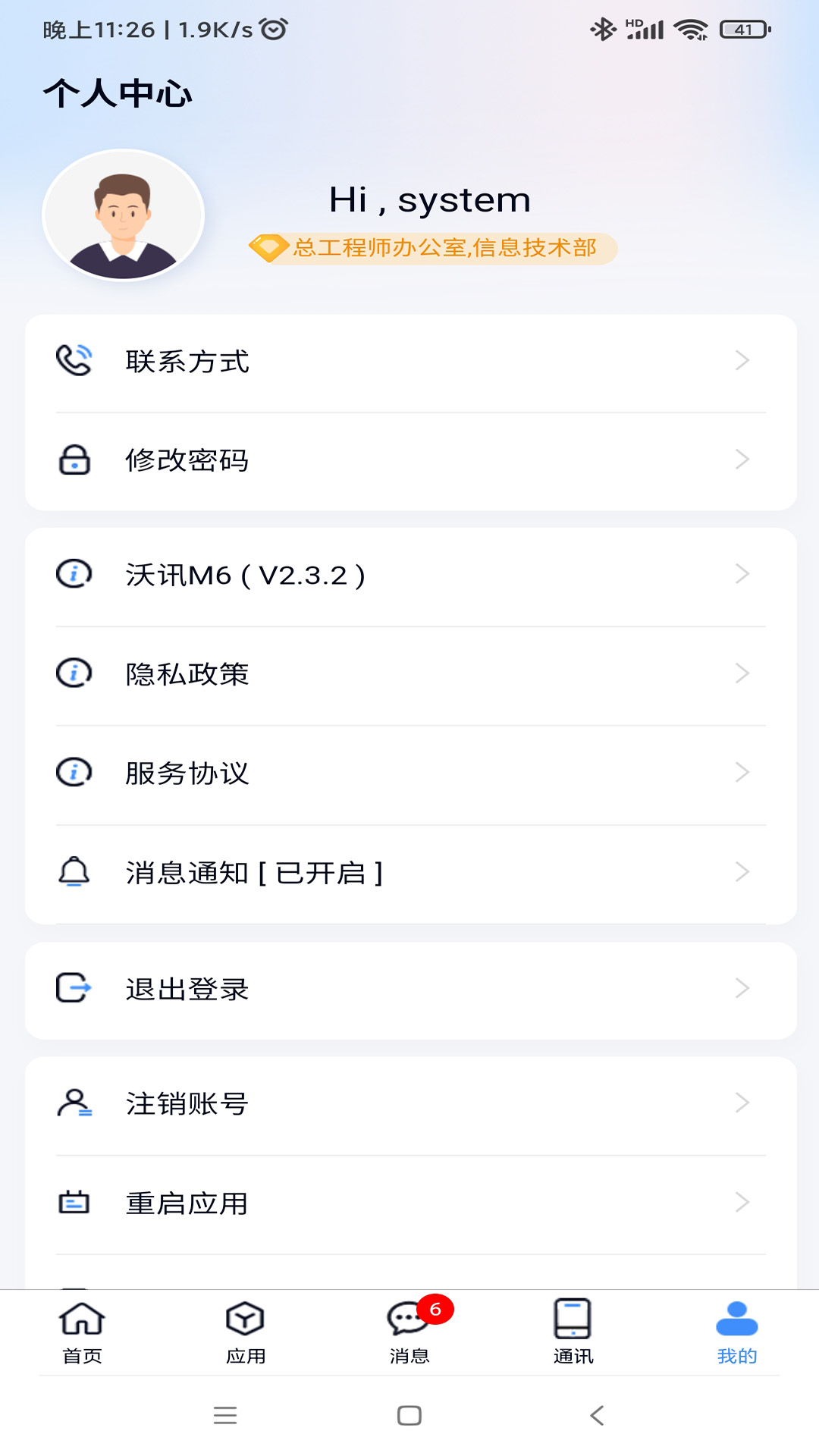 沃讯M6 是新一代移动数字化办公管理的移动APP应用,致力于帮助各类组织建立起一个简捷、高效的移动数字化管理平台!