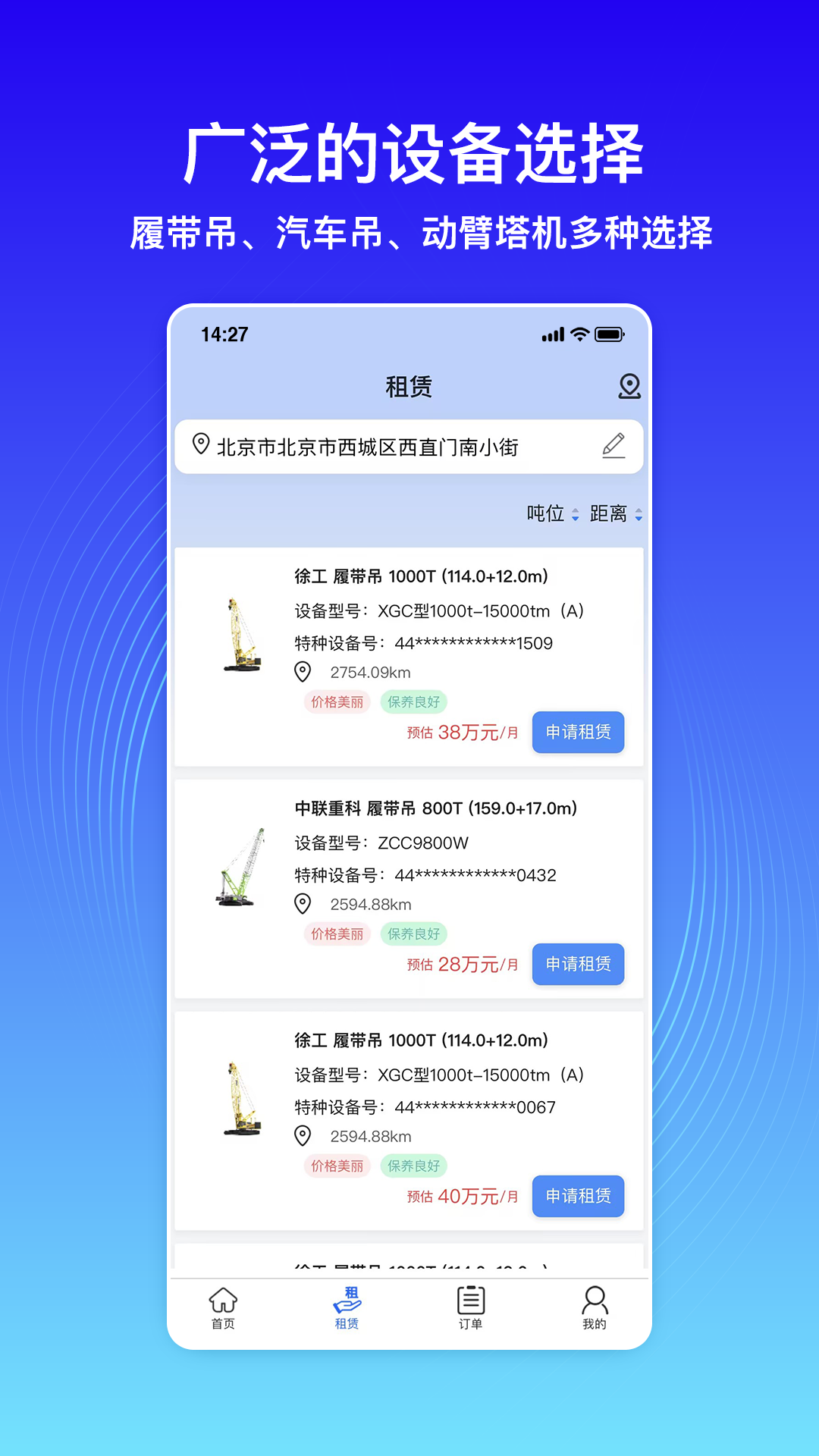 - 丰富的设备种类:履带吊、汽车吊、动臂塔机等各类主吊设备,在这里都能找到,多种选择供您挑选。