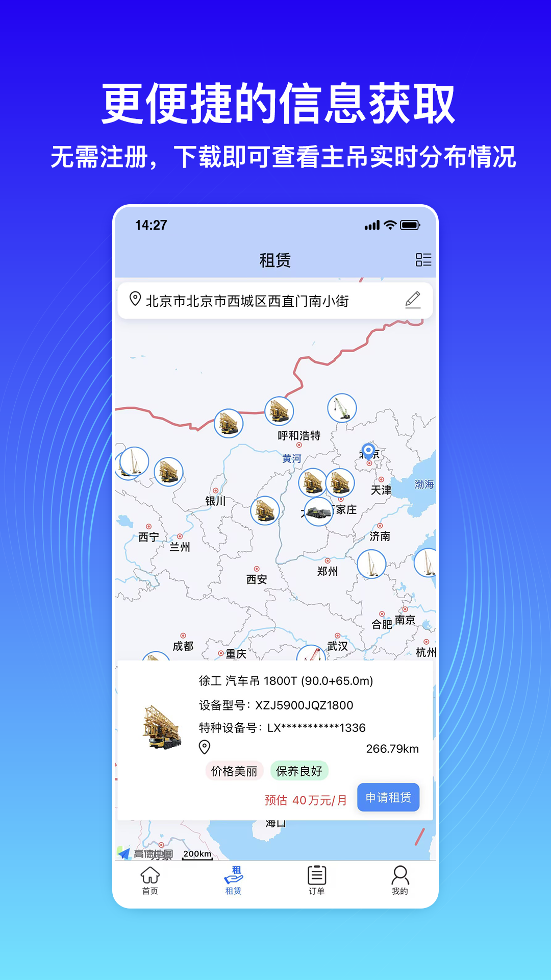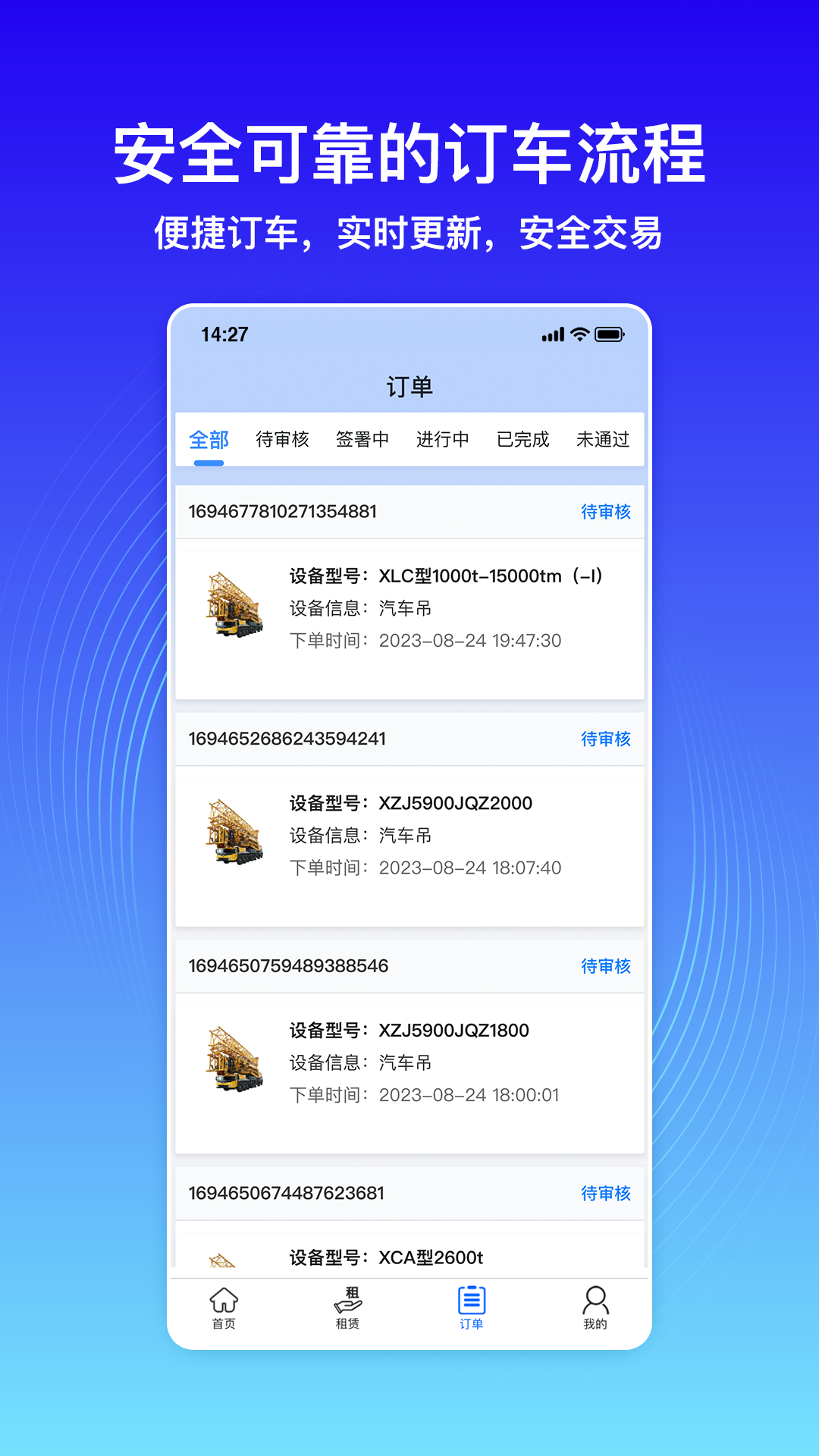 - 安全便捷的订车流程:租赁流程简单便捷,系统会自动处理您的订车请求,并且为您实时更新设备位置和确认价格。支持线上签约支付,为您营造安全可靠的交易环境。