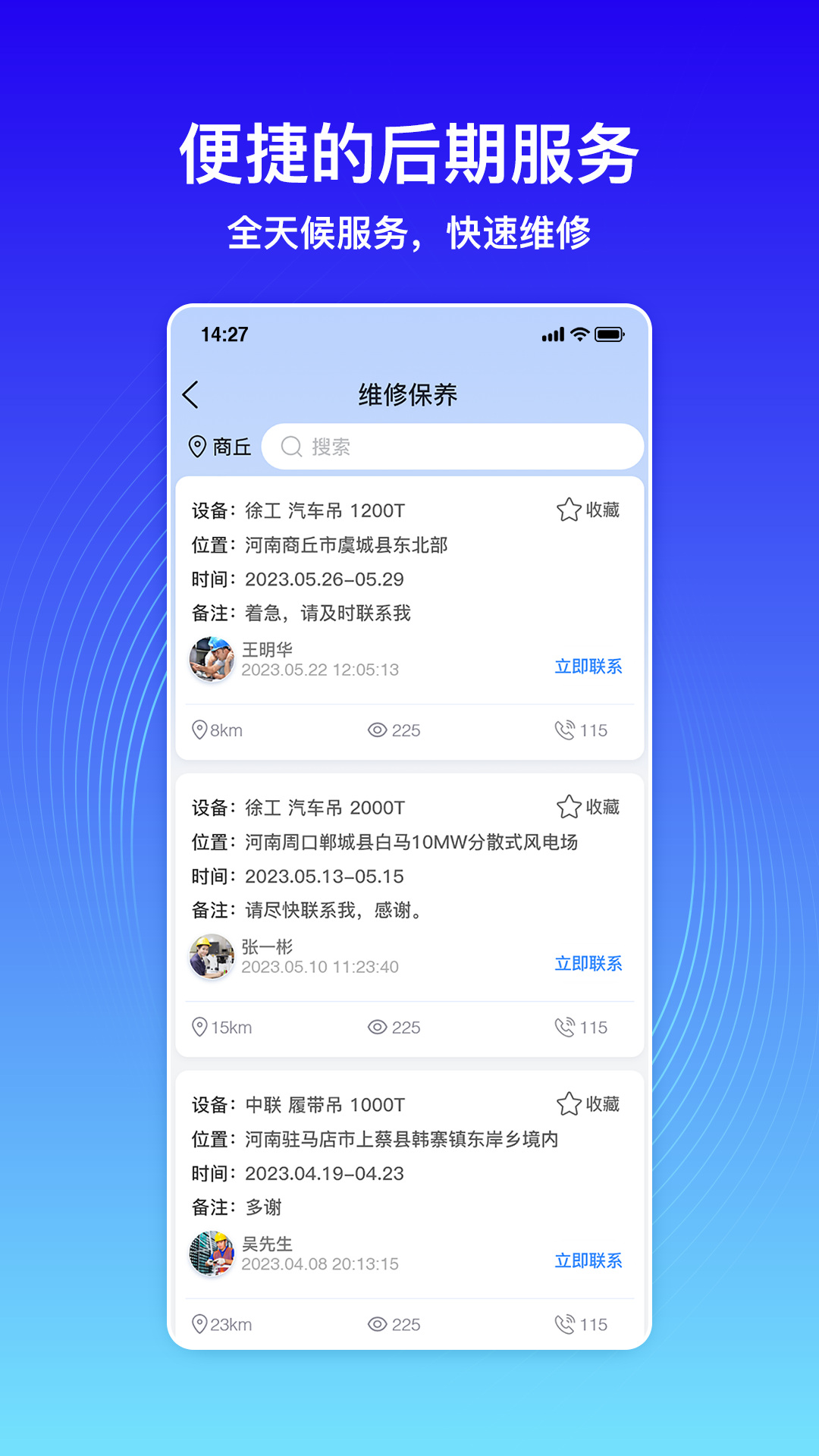 - 免费商机获取:能够实时查看设备的工作状况和所在地,在租赁设备时享受更多优惠。同时,还会提供众多第三方服务,涵盖维修保养、吊车运输以及工程寻找等相关服务。