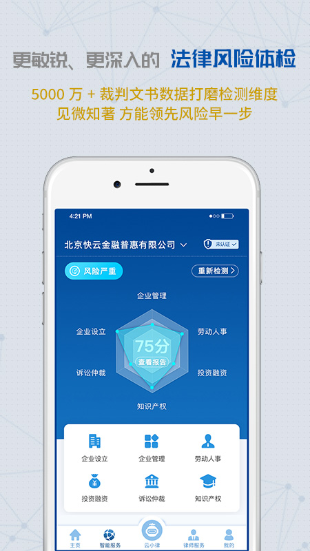 云律通智慧企业法务管家有别于传统法律服务形式以及单纯的在线法律服务。它在互联网空间构建起线上线下联动的企业法律服务与管理体系,集风险体检、智能服务、律师服务、大数据案例分析、法务档案管理、法务资讯看板、多种实用法律工具和全程客服支持于一身。如此一来,企业在从初创设立、运营管理直至融资壮大的各个阶段,都能够轻松获取法律专业团队的有力支持。