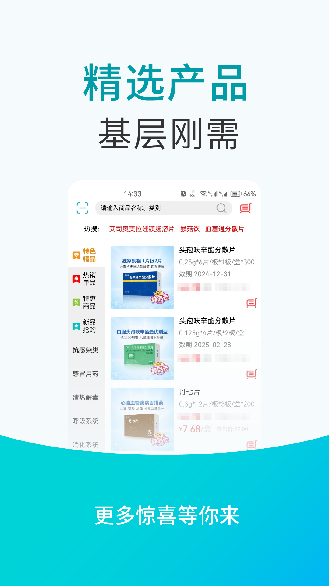 1. 精品直采:精心挑选精品药品,这些药品在基层十分热销。并且缩短了中间环节,可以直接在线上进行采购。