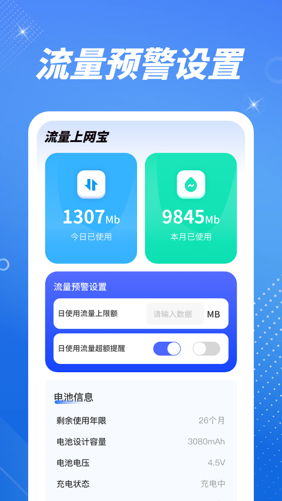 流量上网宝可以设置流量预警来控制每天的流量使用情况以及每日使用流量超额提醒,还可以查看手机的电池情况等;还有丰富的网络热梗让我们度过美好的一天。
