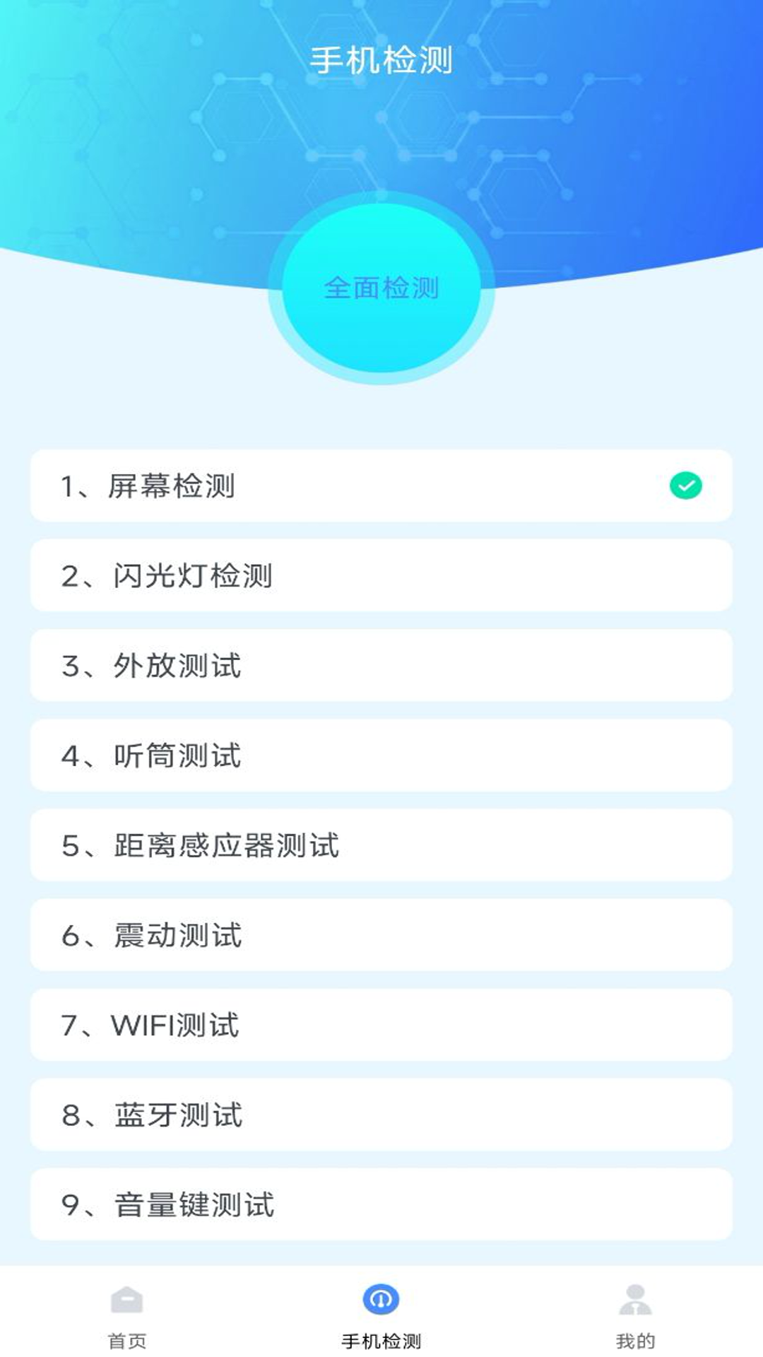提供一系列手机硬件检测功能,包括屏幕检测(坏点、亮点检测)、闪光灯检测、外放测试、听筒测试、距离感应器测试、震动测试、WiFi测试、蓝牙测试、指纹识别测试、音量键测试等,全面检测手机各项功能是否正常。