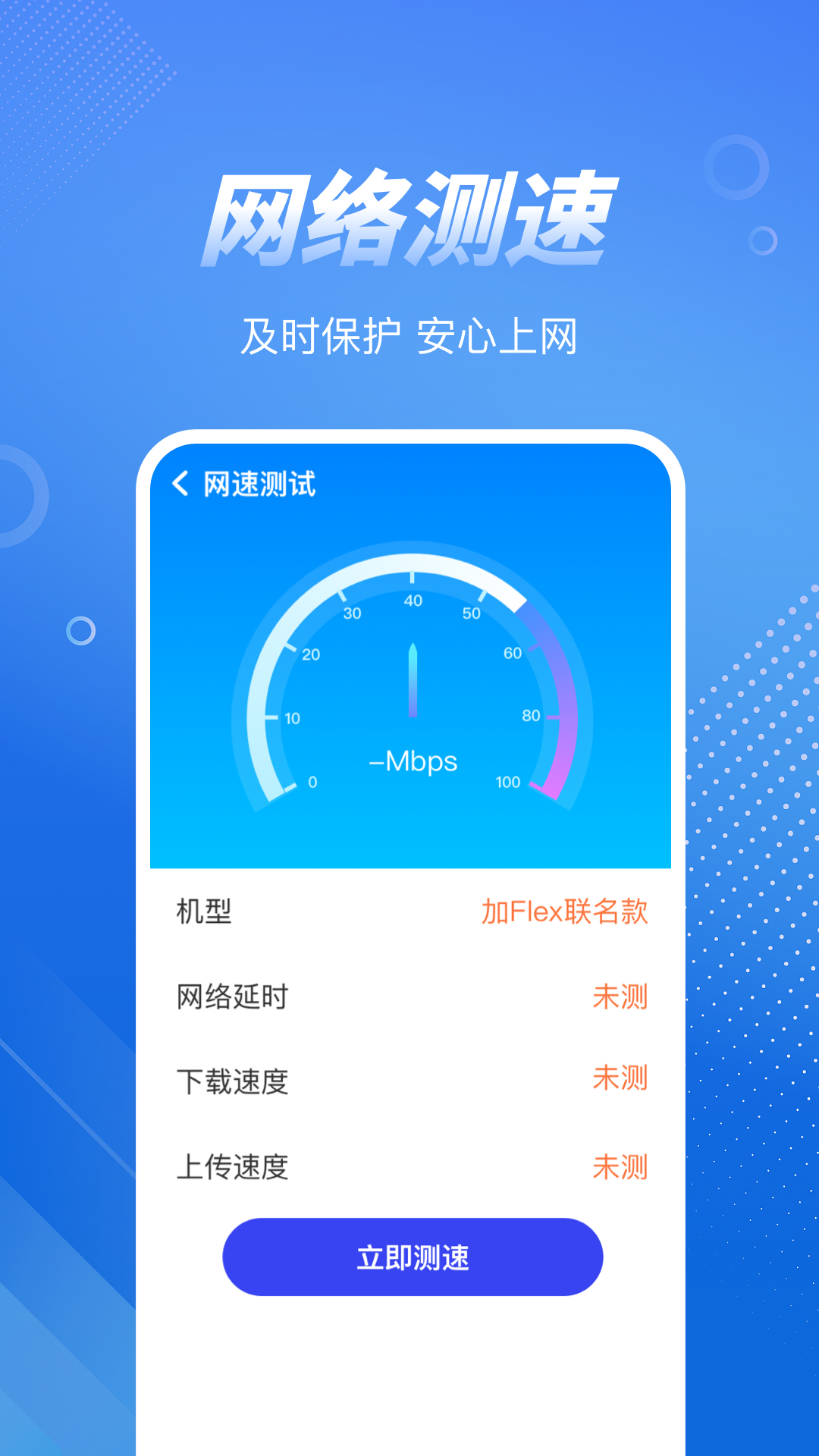 1.一键测速:下载速度、上传速度。