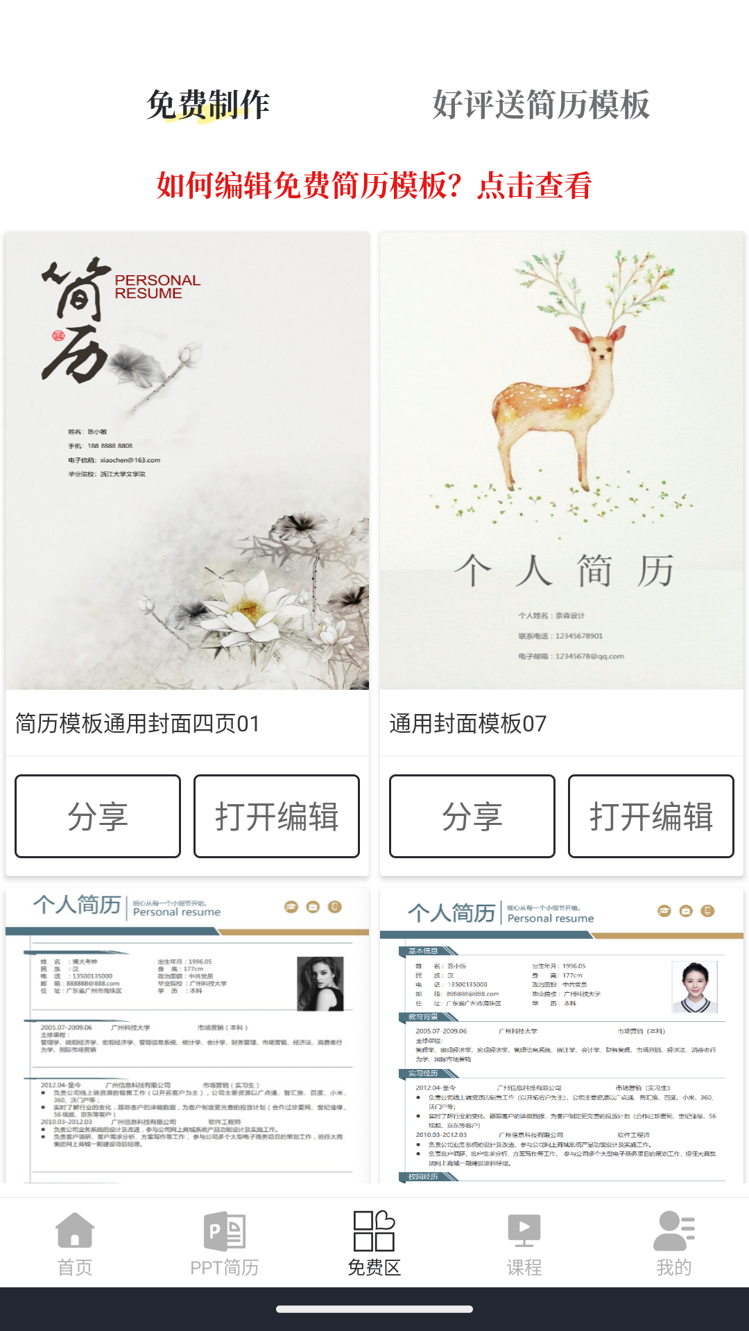 免费区点击任意模板即可打开编辑,推荐使用wps来编辑docx格式的word简历模板。