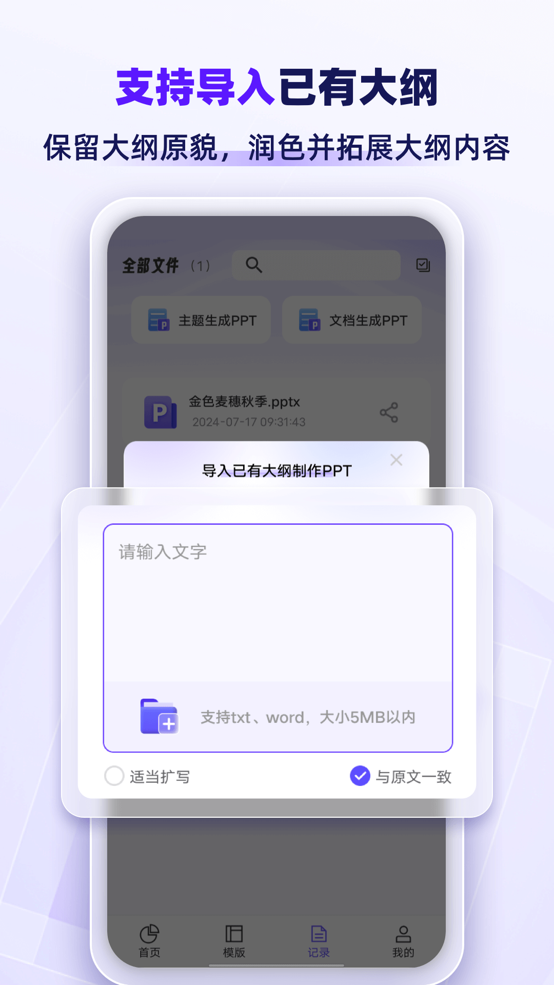 【智能内容生成】借助AI智能CHATPPT技术,它能够对用户输入的关键信息与介绍加以分析,从而自动生成逻辑严谨的PPT内容。用户仅需在应用内输入主题介绍,它就能智能生成PPT大纲,这为用户进行PPT修改提供了极大的便利,真正实现秒出PPT的高效操作。
