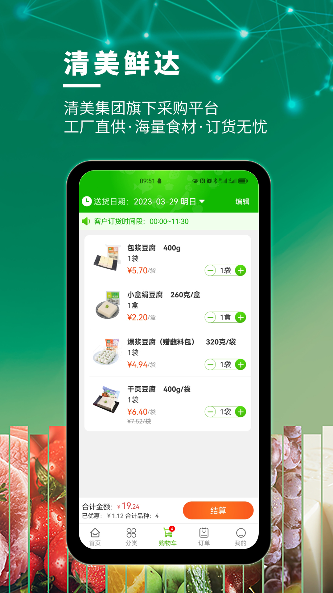 清美鲜达,这一隶属于清美集团旗下的B2B订货APP,为广大客户带来新鲜食材供应服务。它有着诸多显著优势,是餐饮、食堂客户极为优质的选择。