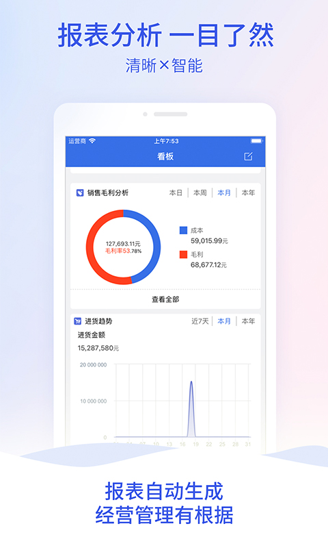 数据看板:支持查看利润表、老板关键数据、热销商品以及多维度的销售分析