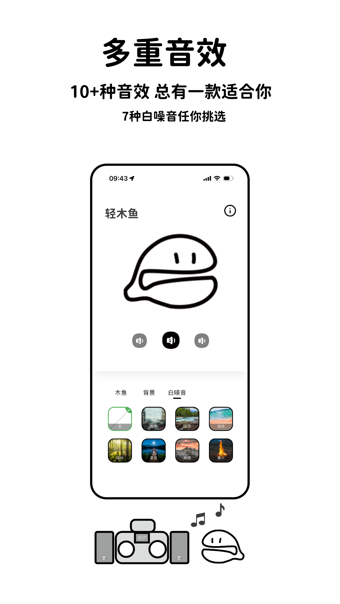 这里提供多种音效任您挑选,其中包括不同的敲击音色以及白噪音,这些音效能营造出各种各样的状态和氛围,满足您的不同需求。