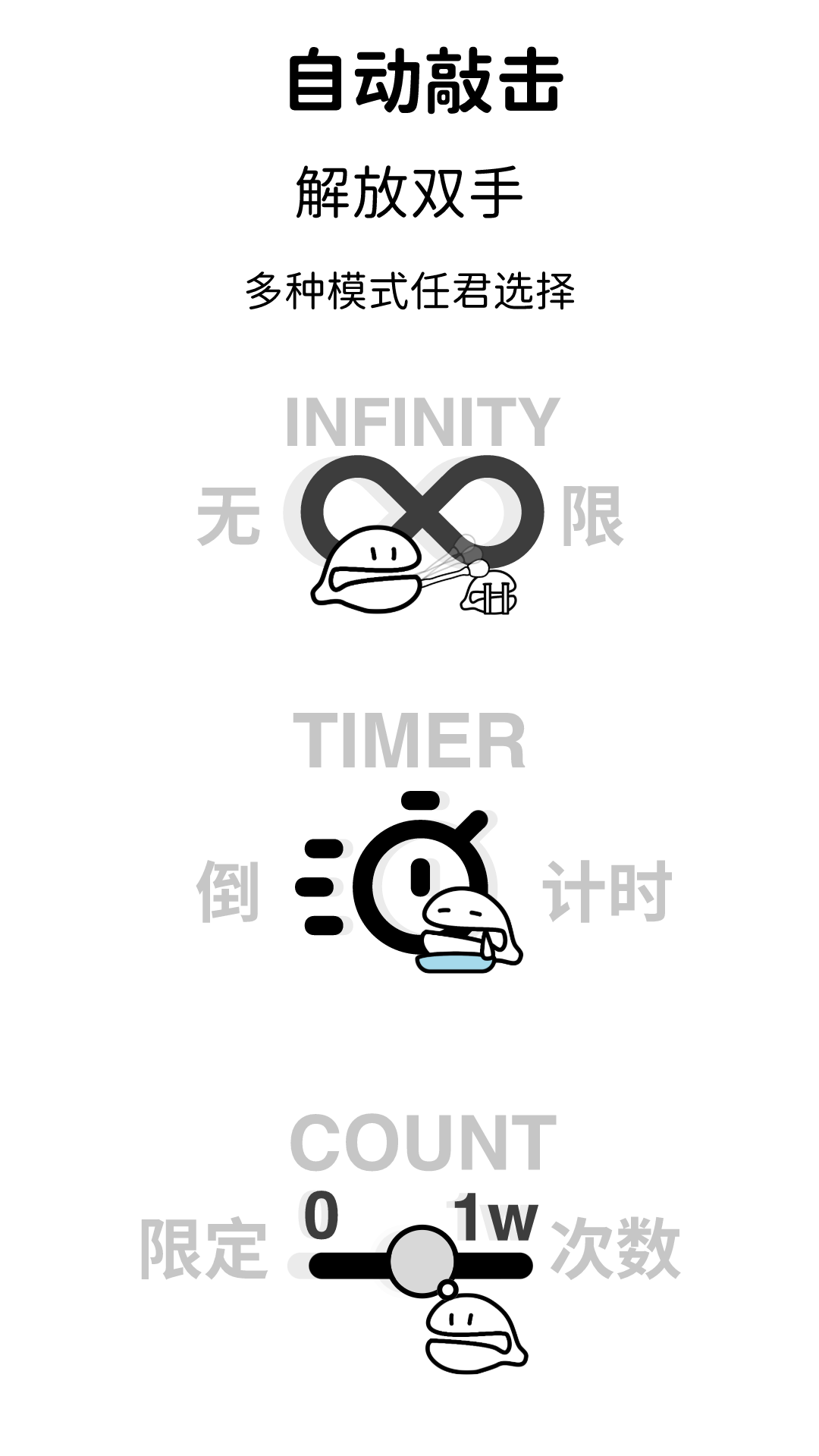 有三种自动敲击模式可供选择,分别是无限模式、限定次数模式以及倒计时模式,您可以根据自己的需求来决定敲击的时长。如果您在选择“倒计时”模式的同时开启“敲击停止自动关闭声音”开关,它将有助于您轻松入睡。