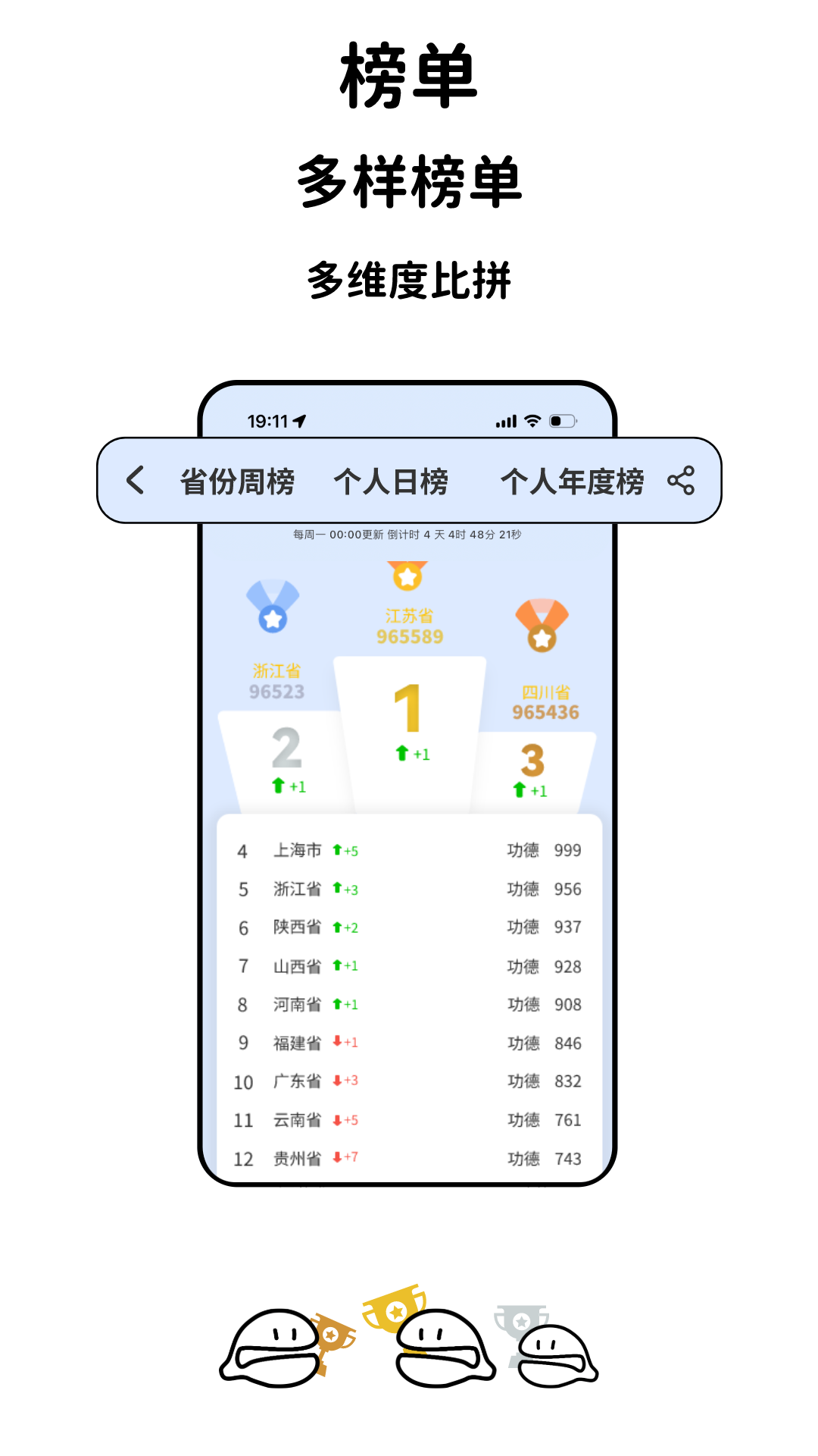 每周都会更新省份榜单,您可以与来自各省的好友一同竞争,清晰地看到全国范围内功德排名以及排名的浮动趋势。