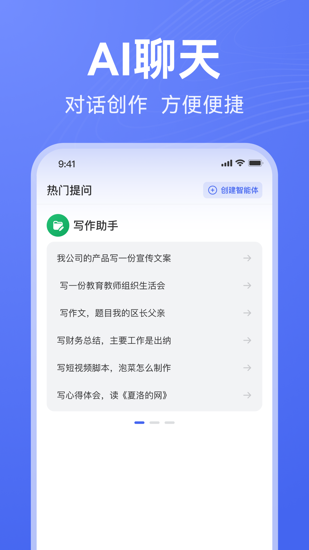 AI写作助手是一款提供AI智能创作的软件,利用人工智能进行内容整合创作,支持各种场景下的不同问答需求。如生活中的麻烦、学习上的难题、工作中的困扰等等,给你提出解决方案。也可以协助创作,便捷高效地获取思路和灵感。