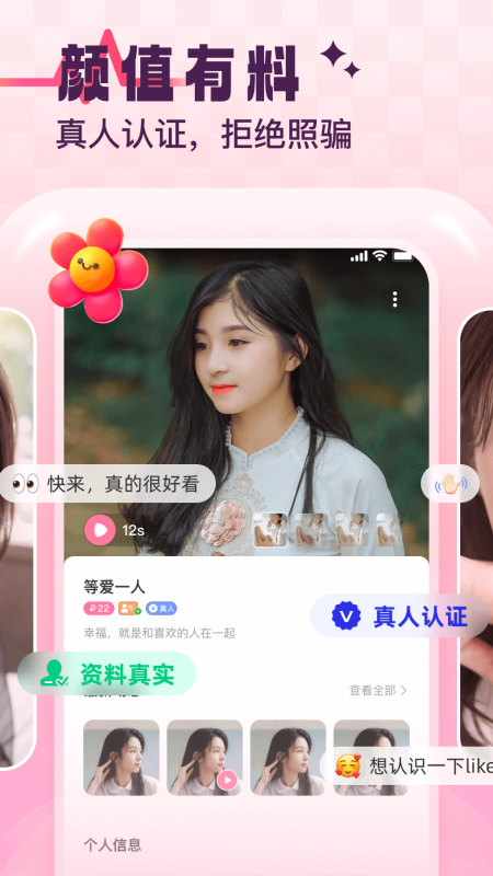【真人认证】我们会安排人工审核用户的认证资料,以保证资料的真实性。心贴心聊天,我们提倡真诚的陪聊行为,保障安全、可靠、纯净的聊天环境是我们坚守的原则。