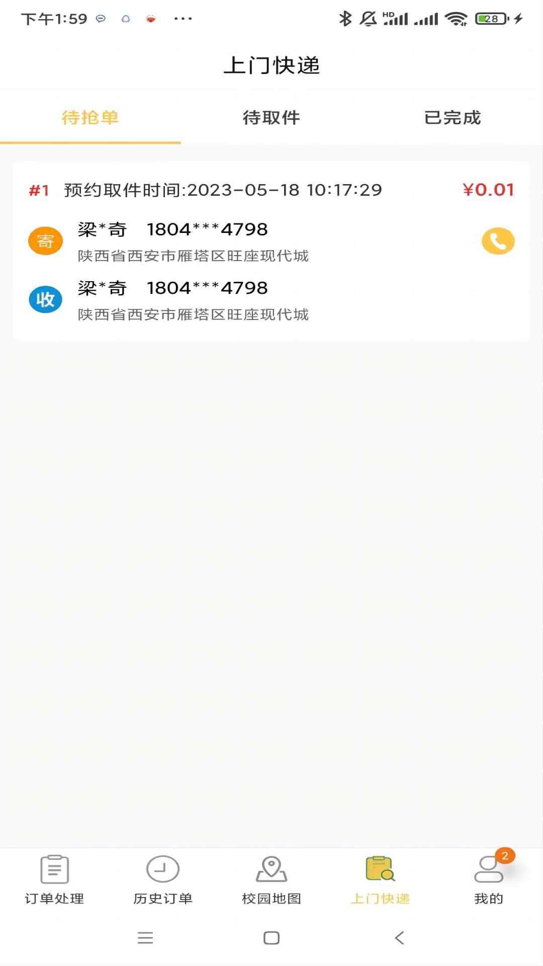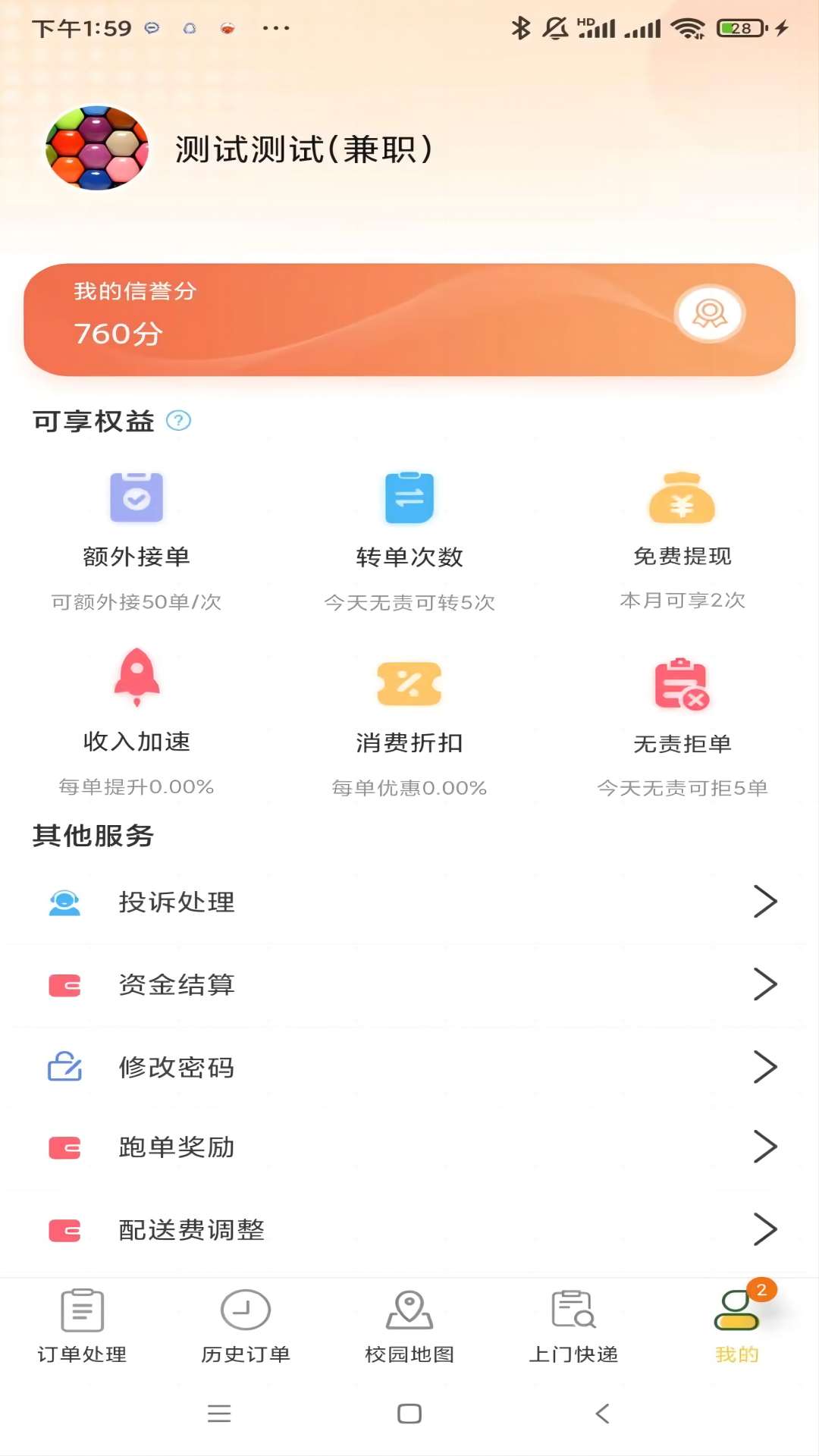 惠玩校园配送端主要为配送员提供便捷及服务,其中功能包括订单处理页面、历史订单页面、我的设置等页面,配送员可在此APP上接收订单,配送订单。及查看历史订单等。
